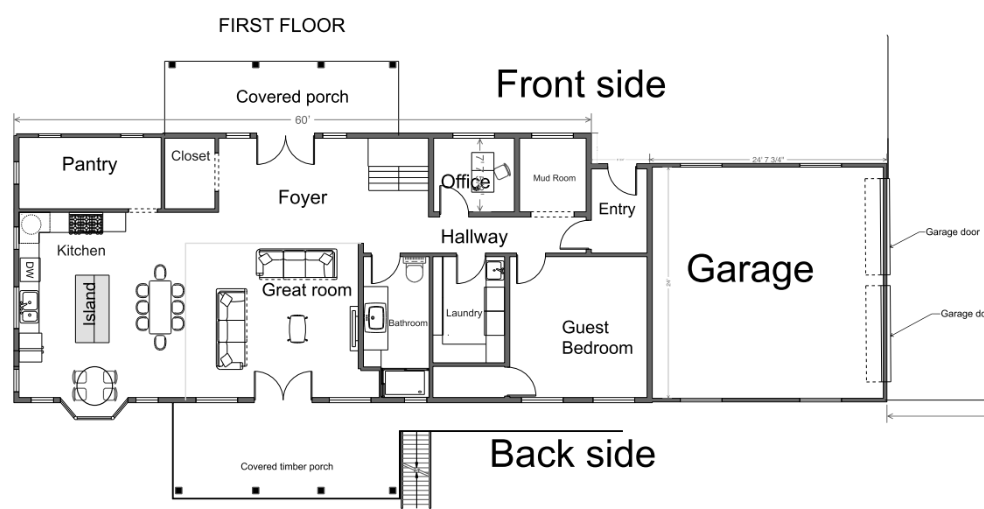 convert this floor plan into a realistic isometric 3d view of a full house show the space from an elevated angle with furniture walls and details visible barndominium timber frame hybrid with modern design elements keep design true to drawing ensure accuracy use the same furniture as shows on the plan do not change the orientation of the floorplan