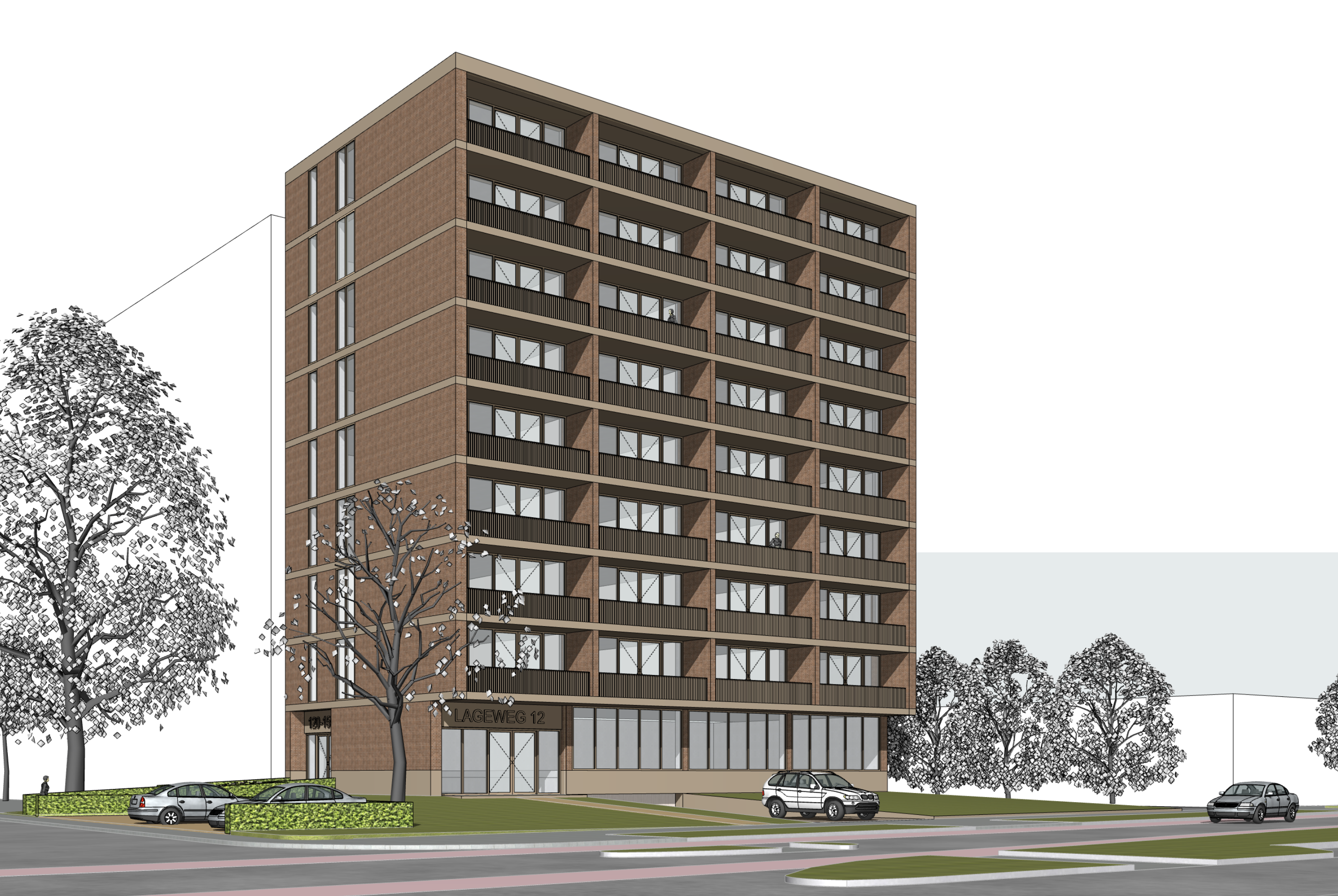 soft overcast daylight with a bright but slightly cloudy sky creates diffused natural light and gentle shadows the street scene feels calm and realistic with a few pedestrians and cyclists in the distance light traffic and a mature leafless tree in the foreground adding scale and depth elegant and restrained atmosphere realistic materials high quality architectural photography neutral color palette understated urban life balanced composition and a natural perspective maintain exactly the same perspective and do not alter the buildings or the site in any way only add subtle landscape elements and a few people walking or cycling to create a calm community oriented atmosphere do not adjust the adjacent buildings just make them bright white to create contrast allow subtle visibility of modern interior elements inside the building with office space on the ground floor and residential units on the upper floors add open white curtains to introduce residential warmth and interior depth the ground floor accommodates office space with a clear open and professional appearance while the upper floors consist of residential apartments with generous windows and balconies clearly expressing the mixed use character of the building the building is constructed in a slightly variegated brick combined with coloured concrete resembling ral 1019 the window frames and balustrades are also finished in ral 1019