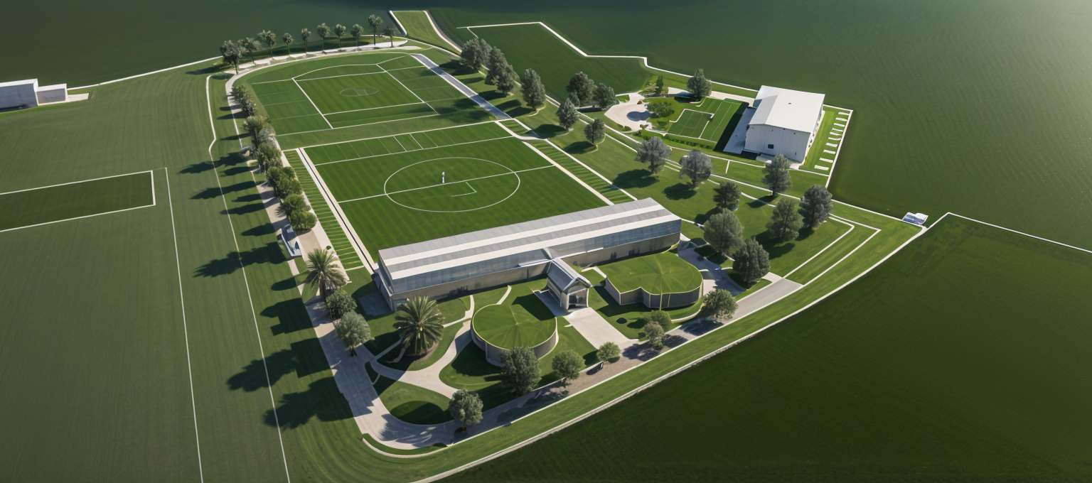 exterior shot a square courtyard with building in front green facade scultures and plants in the garden