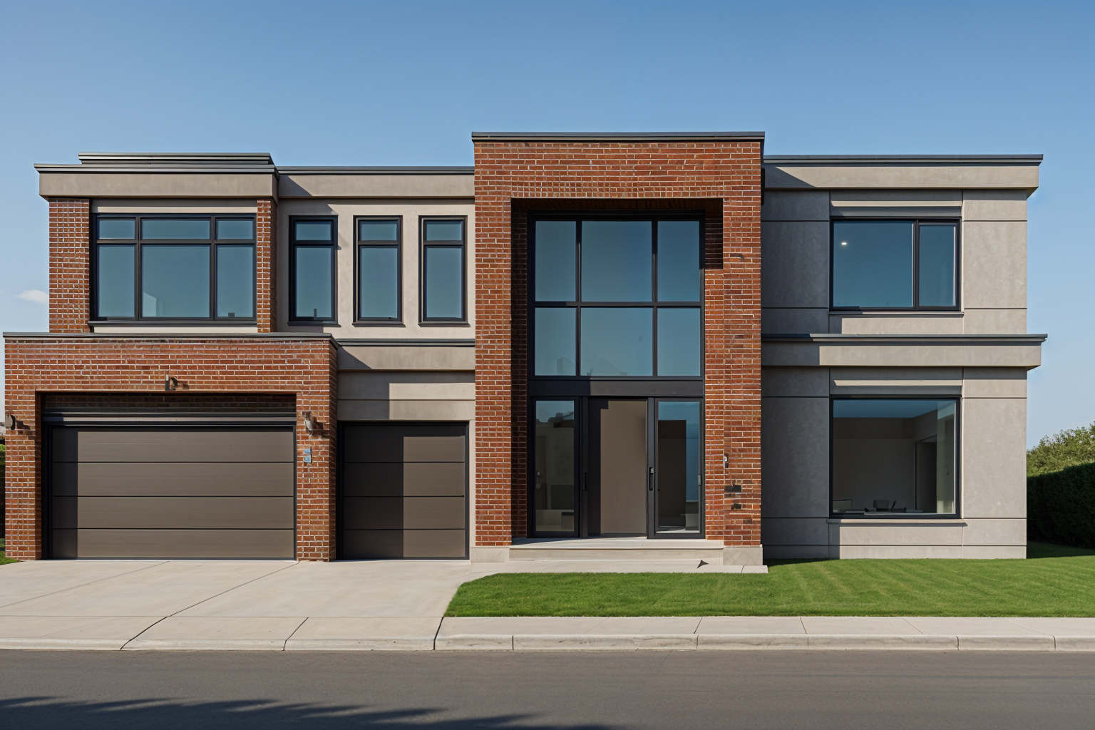 modernist exterior shot off white brick off white siding cream windows dark beige roof in a forest architecture