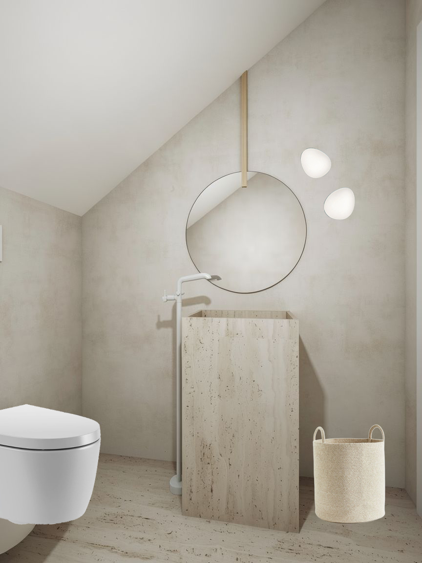 realistic high resolution render the wall has a off white light beige cemento effect there is a circular mirror slightly larger in scale enhancing the sense of space above it a thin vertical wooden slat extends from the top of the mirror up to the ceiling adding a subtle architectural detail the overall atmosphere is calm minimal and refined with natural materials and a clean architectural aesthetic the celling is white the only light sources are the sconces the celling is white
