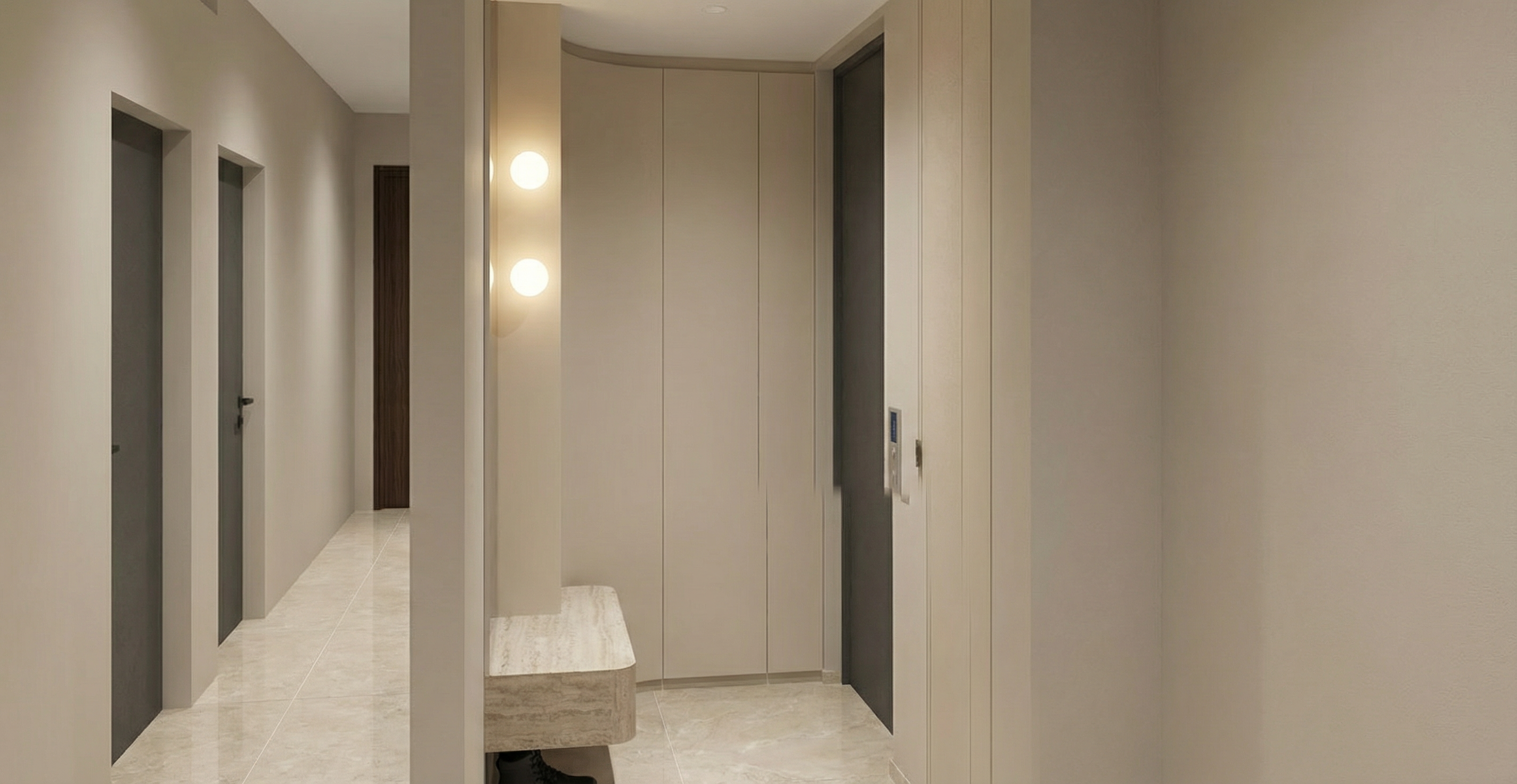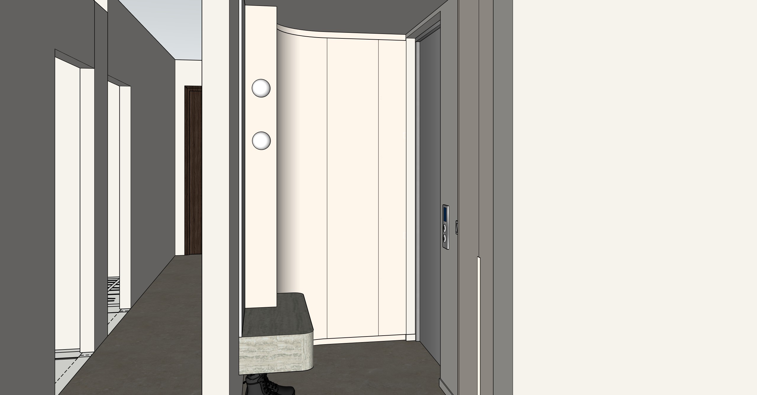 the cabinets are in a light beige solid colour the floor is light beige granite the ceiling is white the spheres are lights the settee is travertine laminate