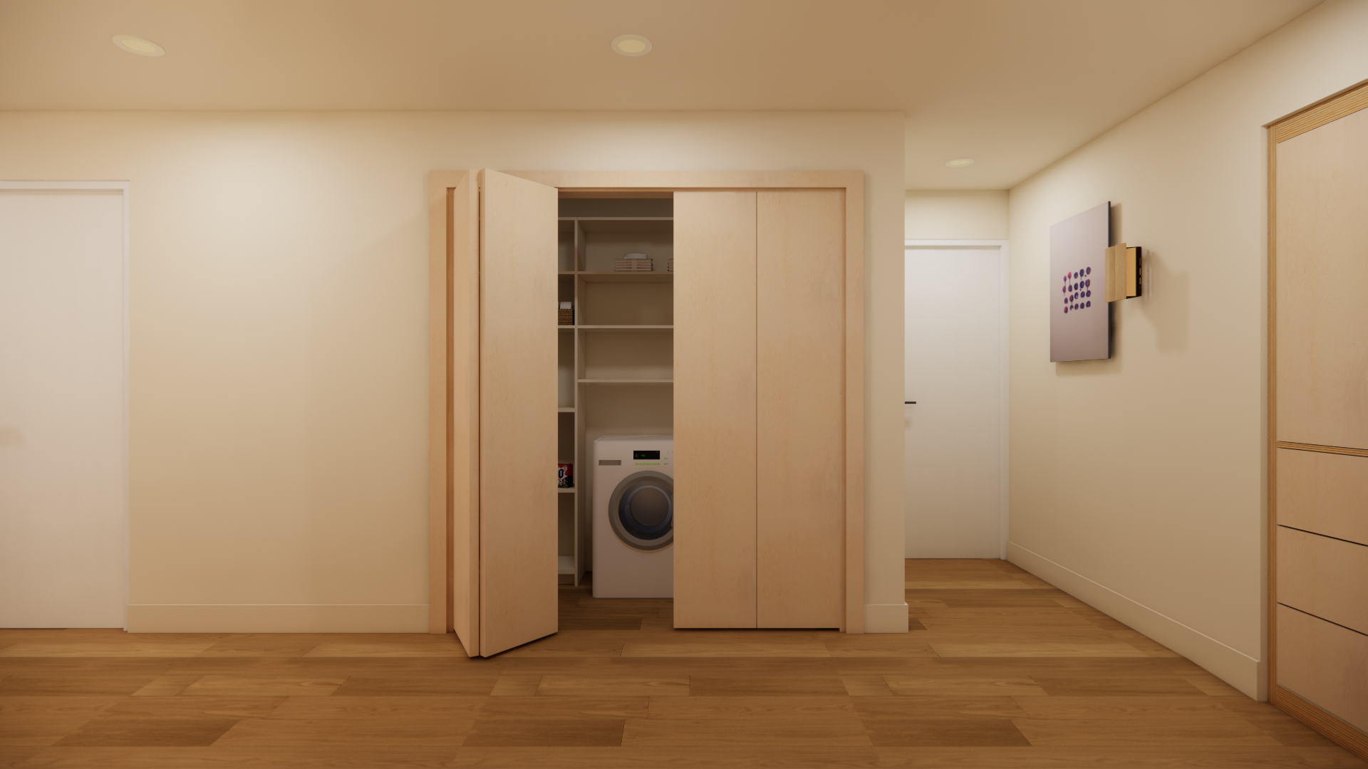 without sunlight only artificial light from recessed light create a realistic render of this image maintaining all colors and materials