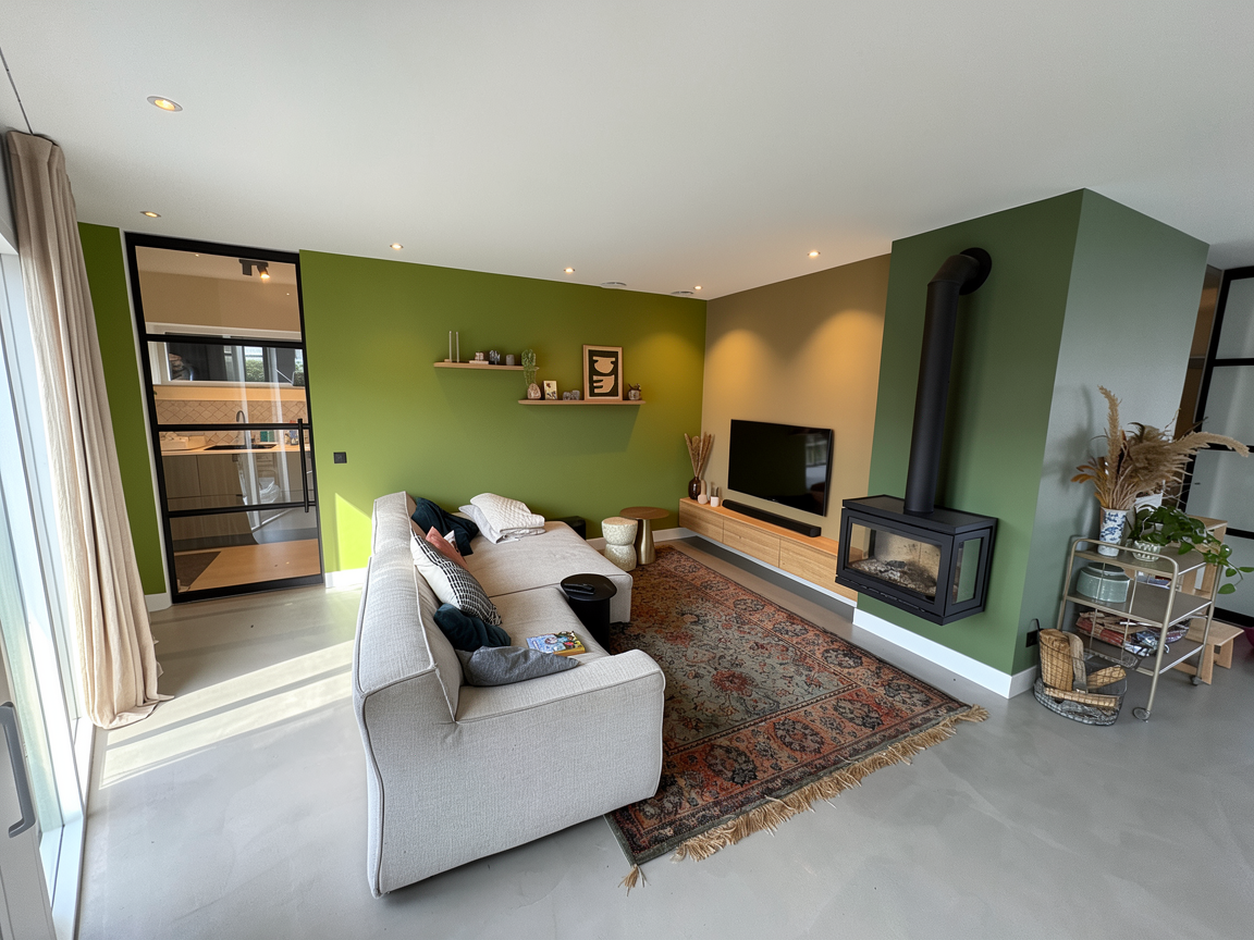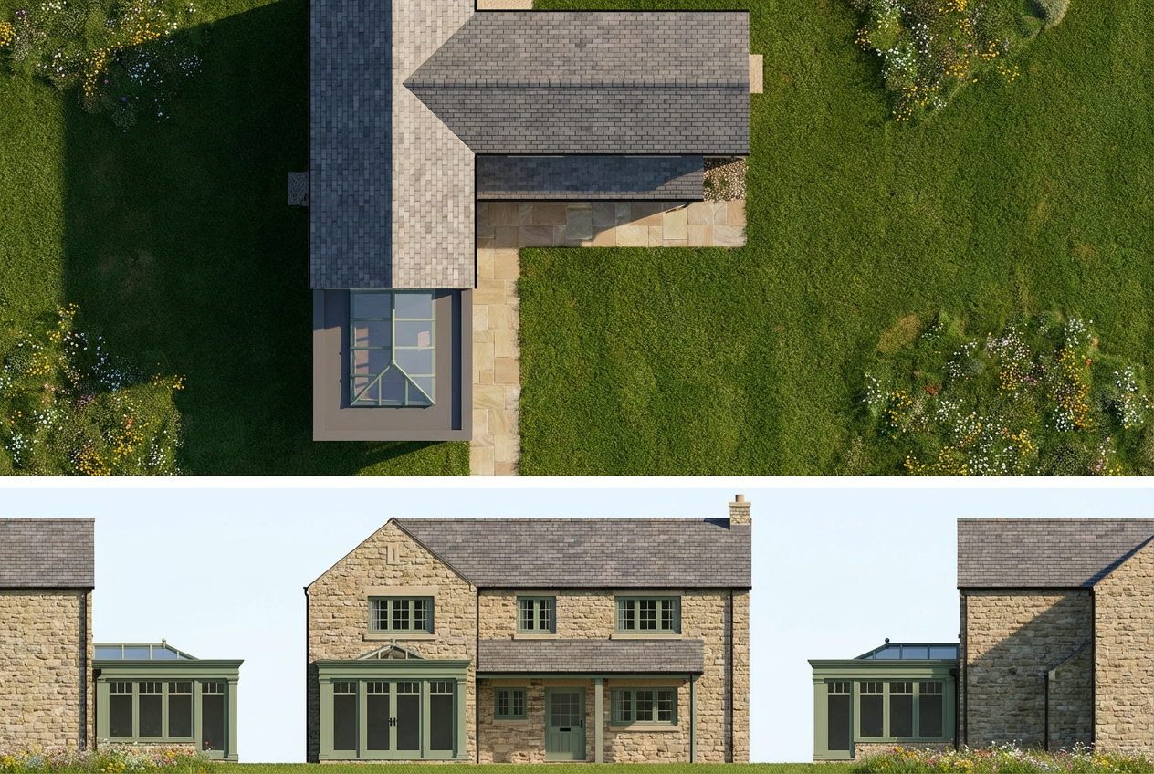 i have drawn a roof plan front elevation and two partial side elevations to create a 2d photo realistic render the walls are a large natural stone the windows are farrow and ball vert de terre the door handles are black the guttering is black the roof tiles are natural slate there is a indian sand stone patio in front of the house with grass in front of that and some wild flowers