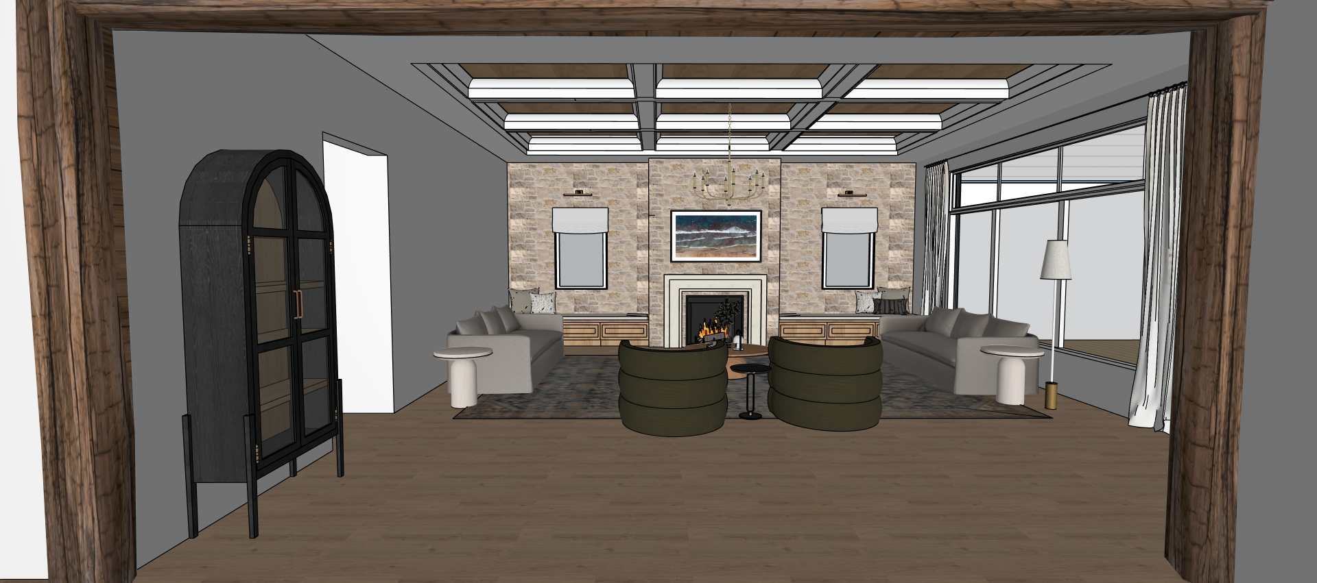 medium brown wood flooring white walls white windows neutral light stone white coffer ceiling with wood above