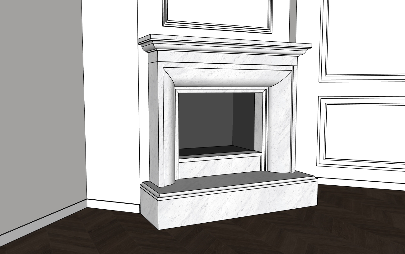 make photo realistic add fire in fireplace natural light come from camera corner wall and moldings are white keep existing don t add anything keep colors and textures dont add moldings just keep excising