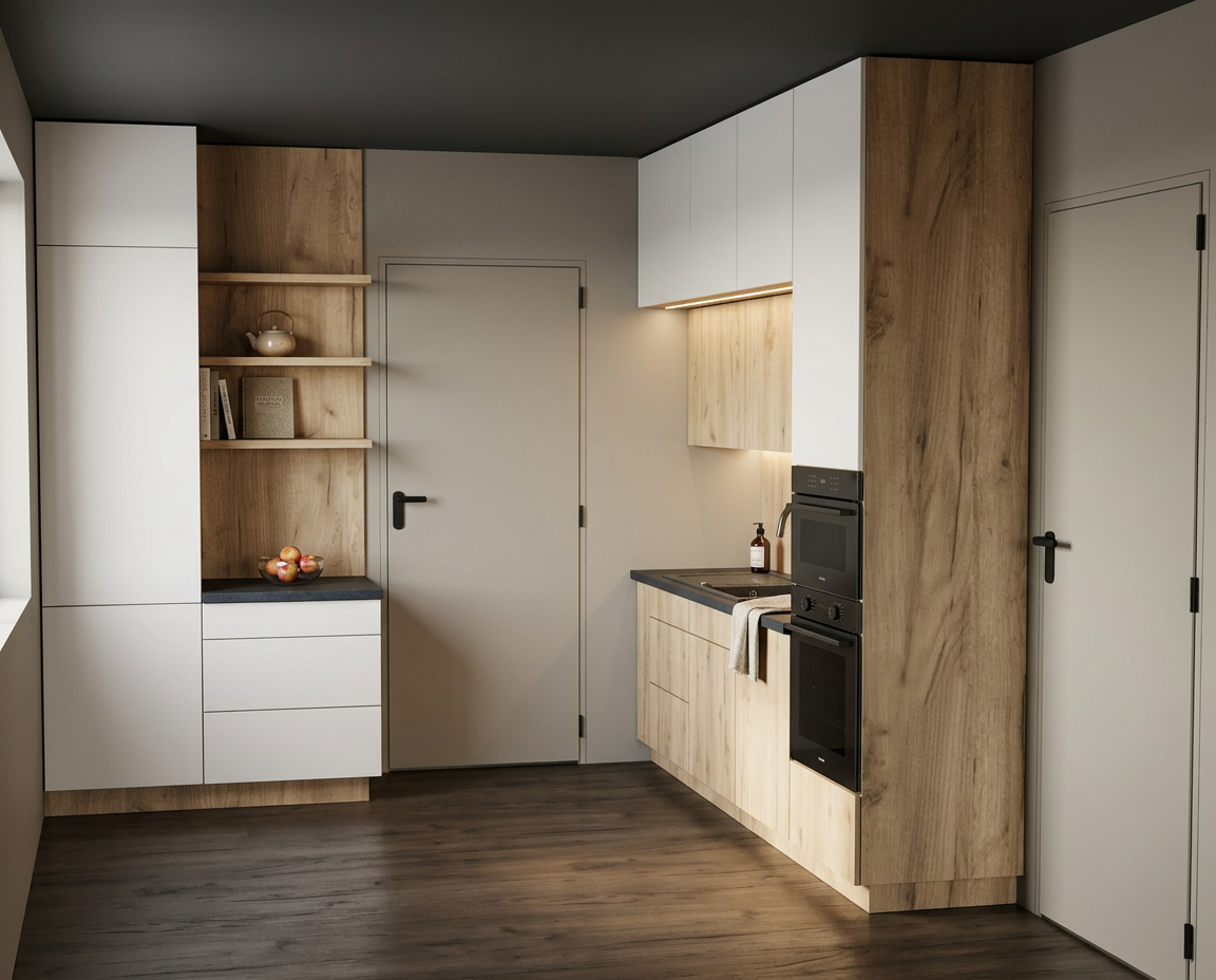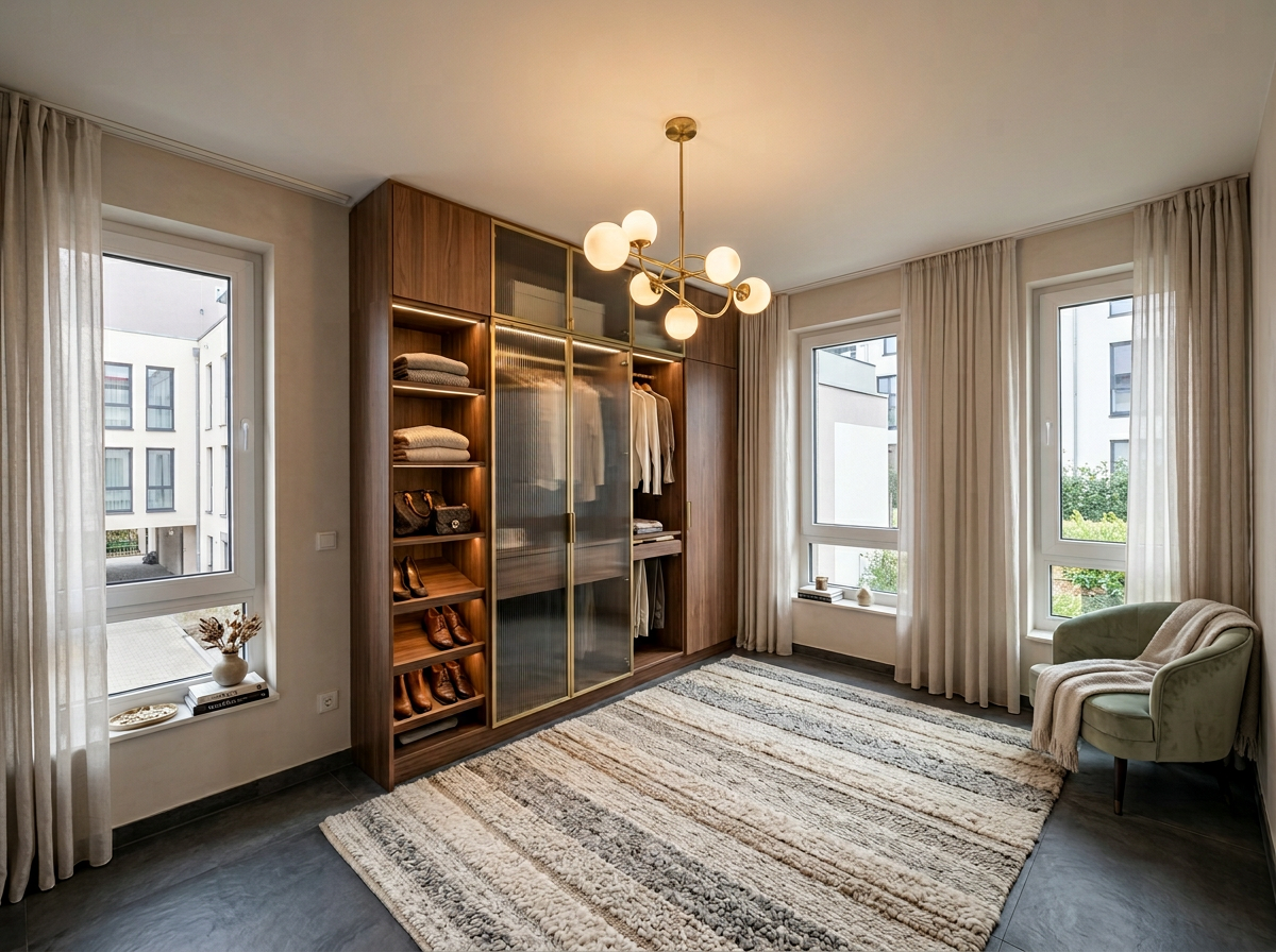 only add the furniture and do not change anything create a modern and cozy dressing room here make sure the floor plan and existing conditions remain unchanged place a high quality wardrobe opposite the headboard a rug in the center and an overall cozy look