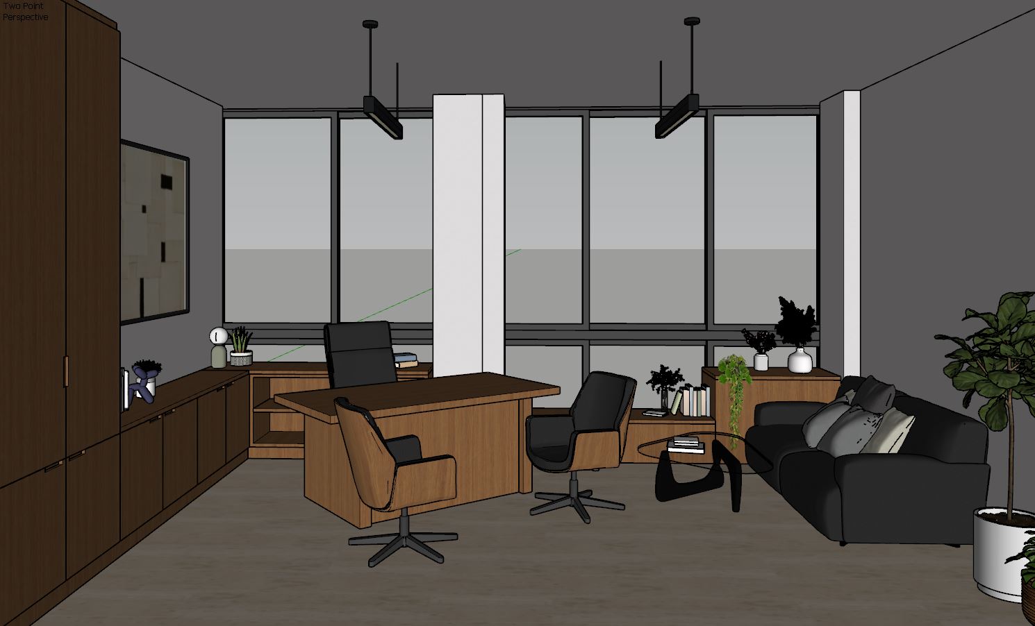 prompt this is a notary office the floor is limestone marble the walls are white the desk is wooden oak all the cupboards are wooden oak with integrated pulls the sofa is charcoal grey fabric with sage green pillows the partition is wooden oak negative prompt do not change geometry