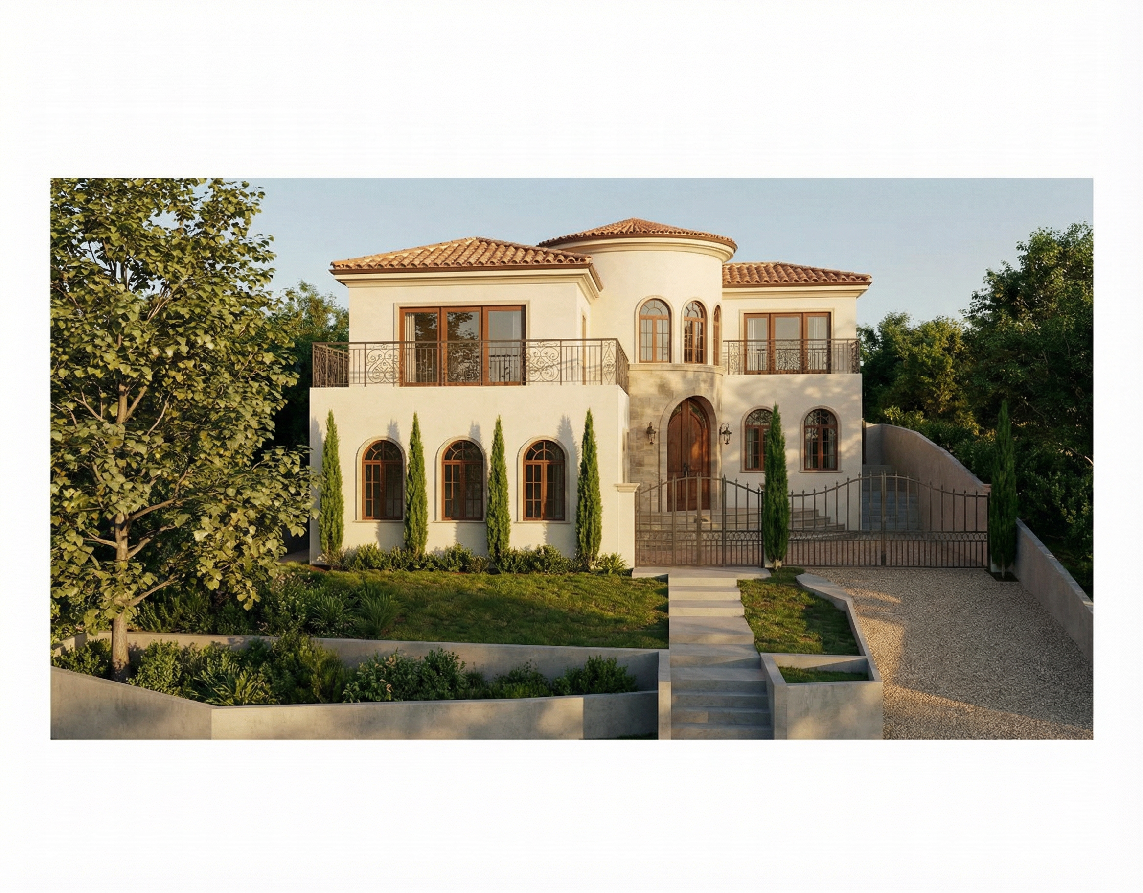 use this sketch by my architect to generate a hyper realistic visual of this building the roof is handmade clay tiles and the walls are flint with red brick detailing add landscaping to the garden areas the track in the foreground is to be gravel add sky and trees in background make it look classy