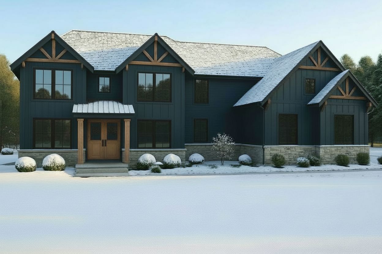 blue siding black trim around every window black gutters added