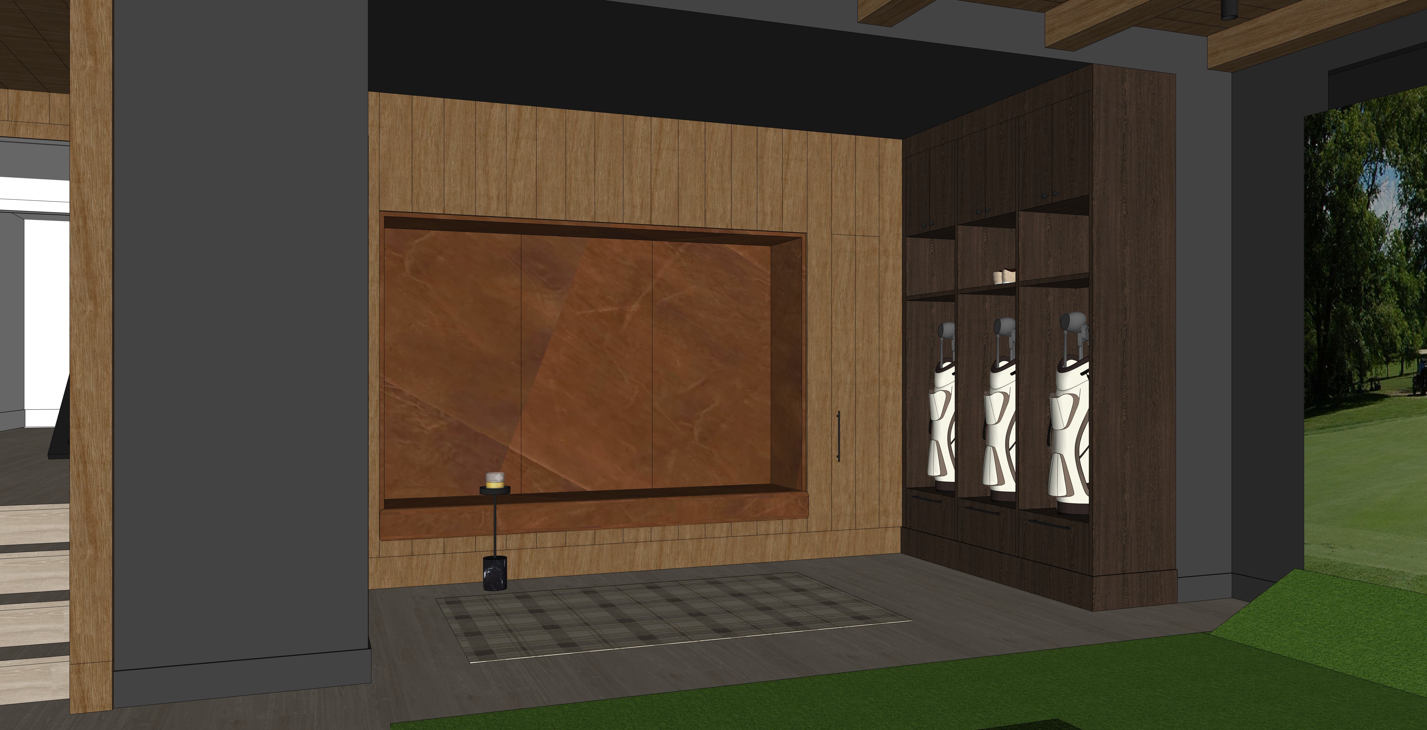moody basement has rustic white oak paneled wall in the background leather bench built into wood paneled wall comes with leather sides and ceiling blond white oak hardwood flooring chocolate stained white oak golf club storage in middle ground