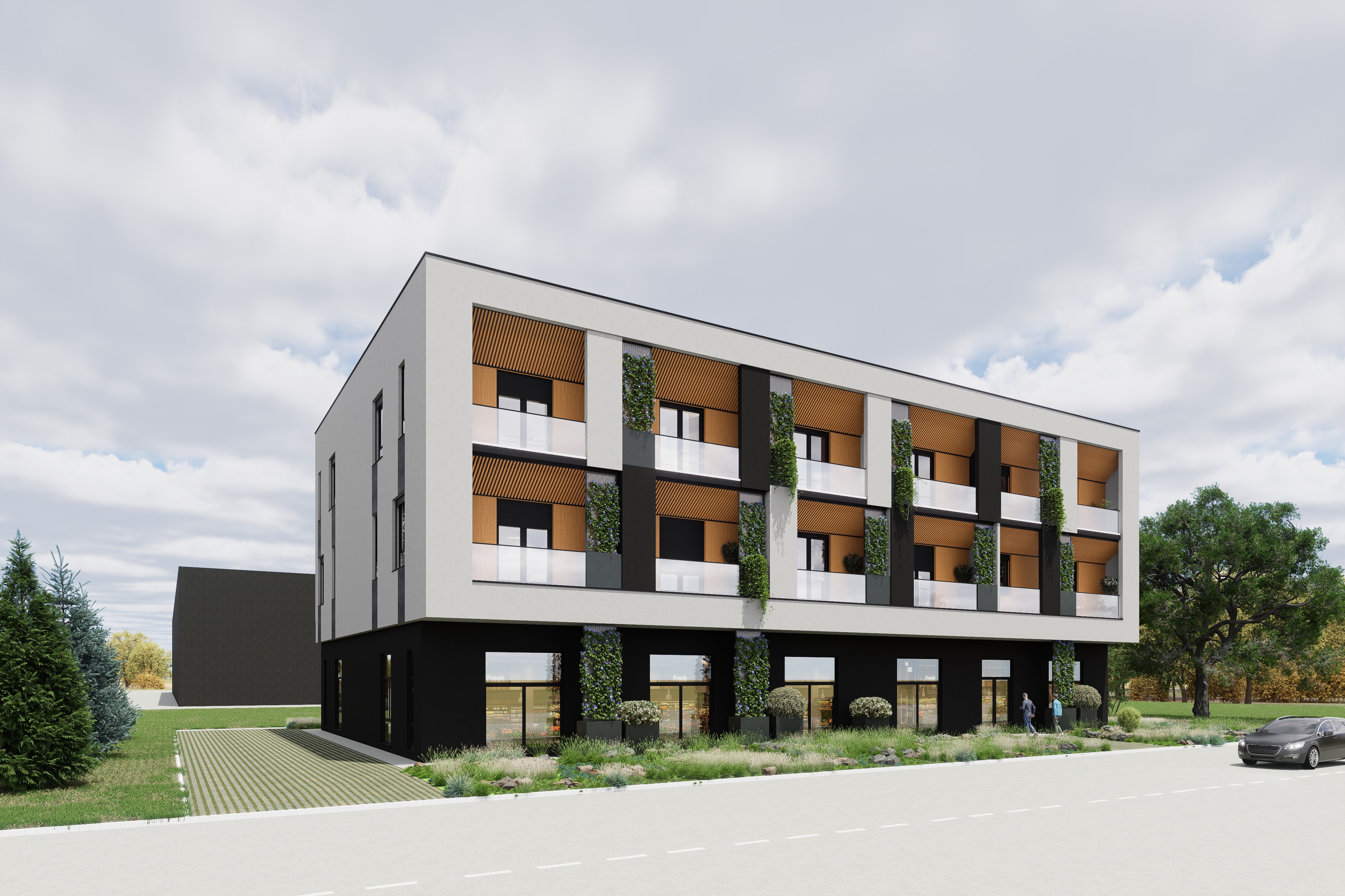 do not change architecture just add light sky and landscaping to look more realistic