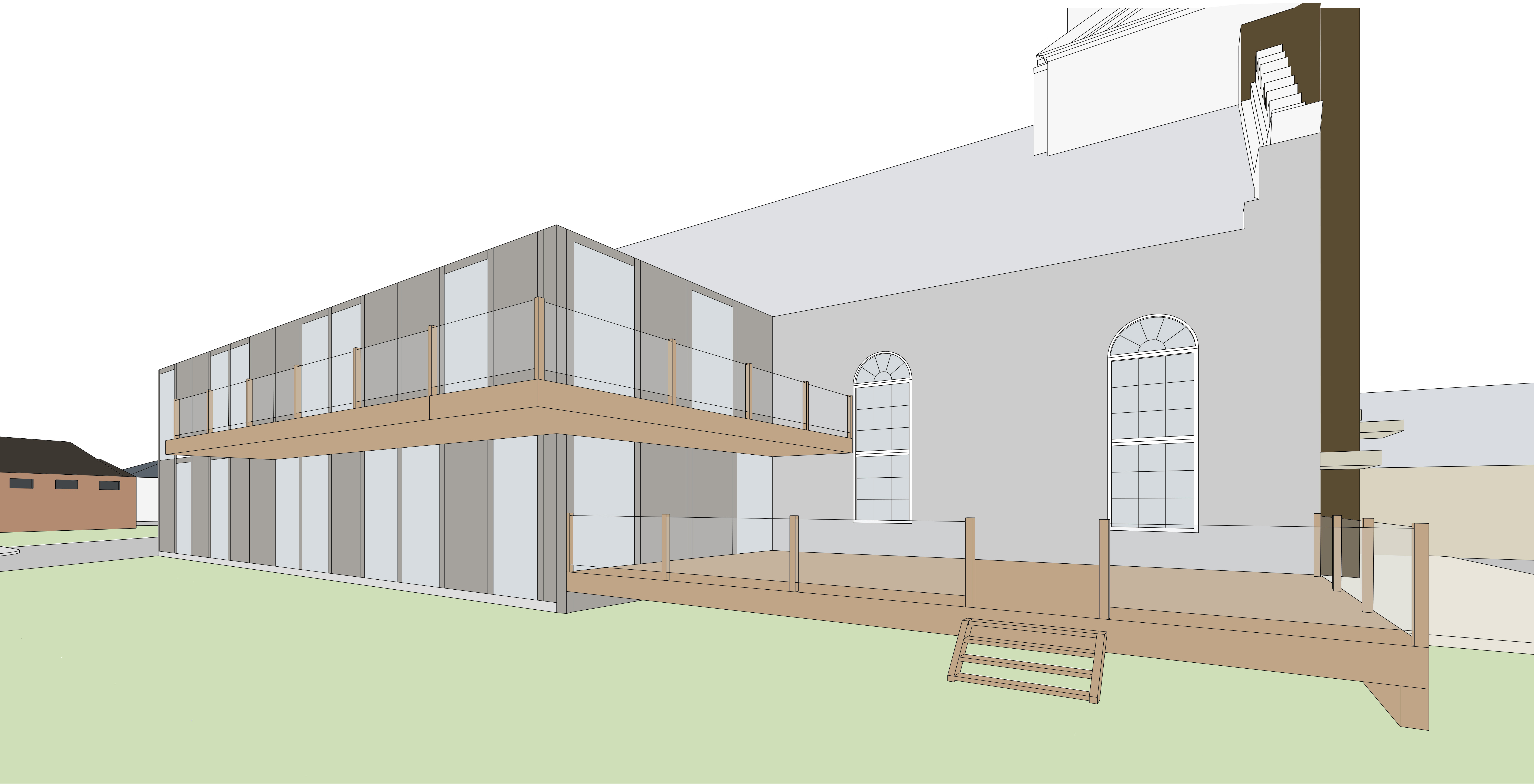 keep the exact same view proportions and colors as the reference image i only want you to add simplified textures while keeping a cartoon collage like style not hyper realistic apply the following textures on the pale grey wall of the church add a light stone texture on the silver grey roof of the church add a metallic cladding texture on the dark brown wall of the church right side add a brick texture on the dark grey walls of the rectangular extension add a wood texture the terrace and the balcony should also have a wood texture add grass texture and asphalt texture to the ground for the neighboring buildings visible on the sides keep their brick walls and apply asphalt shingle texture to their roofs make sure the windows show subtle reflections like real glass maintain the overall cartoon hand cut collage feel of the original image while enhancing it with clean stylized textures