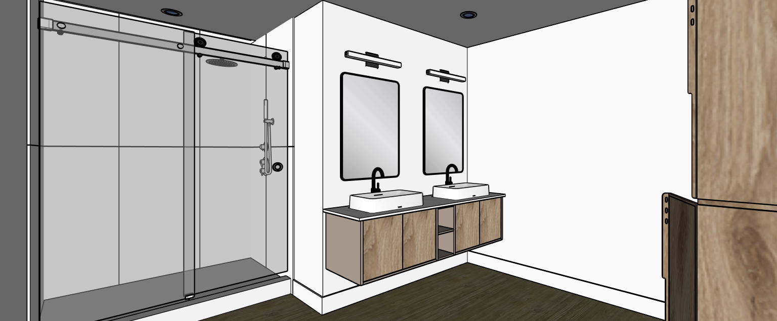 render photo realistic bathroom batte black fixture and trims large format 24 x 48 shower tile grey wall graze linear light at shower back wall recessed lights white trim under vanity cabinet linear light add painting at empty wall add outlets and switches at appropriate locations