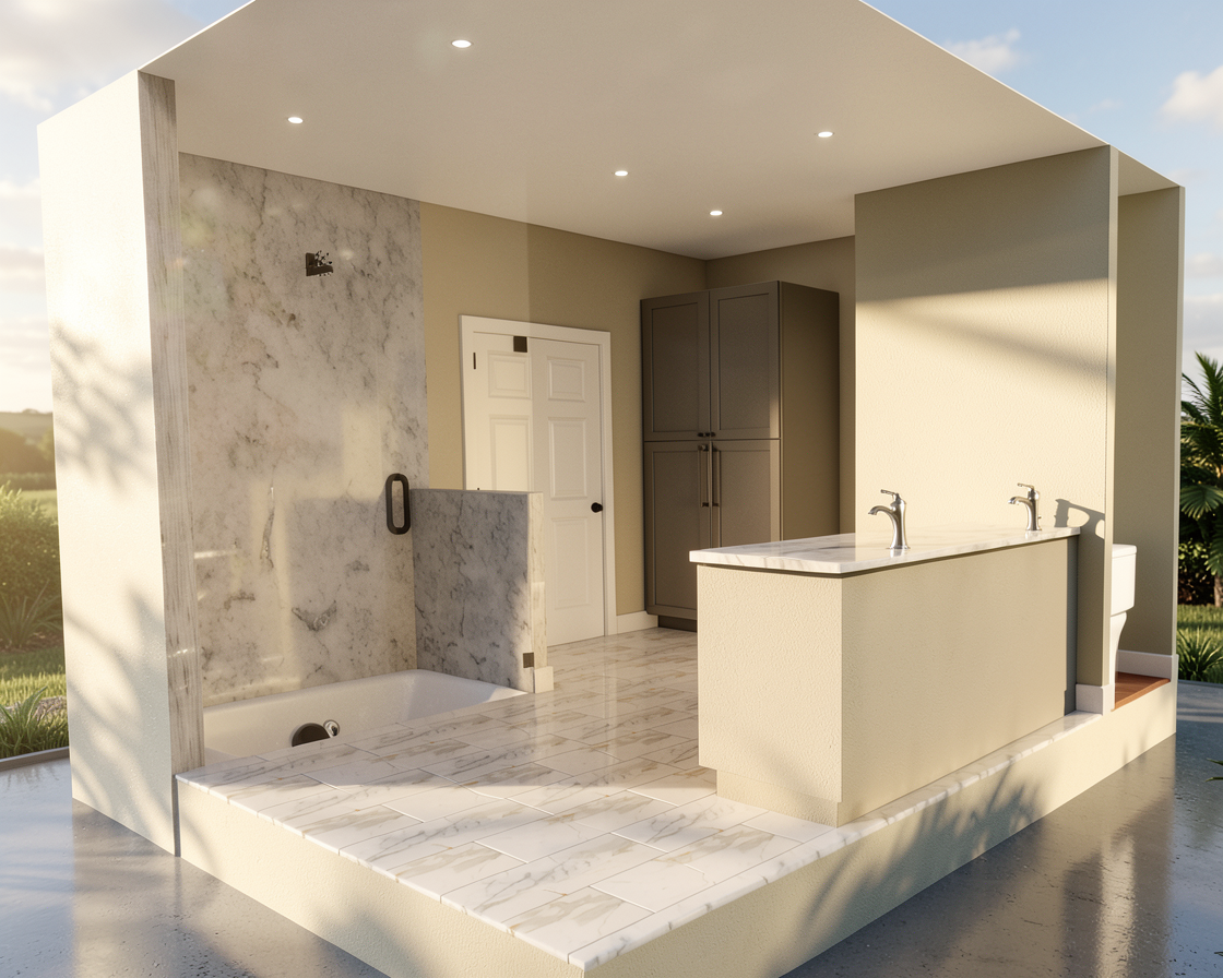 make a realistic appartment terrace with warmer daylight keep a realistic background the pouf and a pillow are in brown velvet for the other two pillows keep the color and texture large beige grey tiles keep textures and dimensions