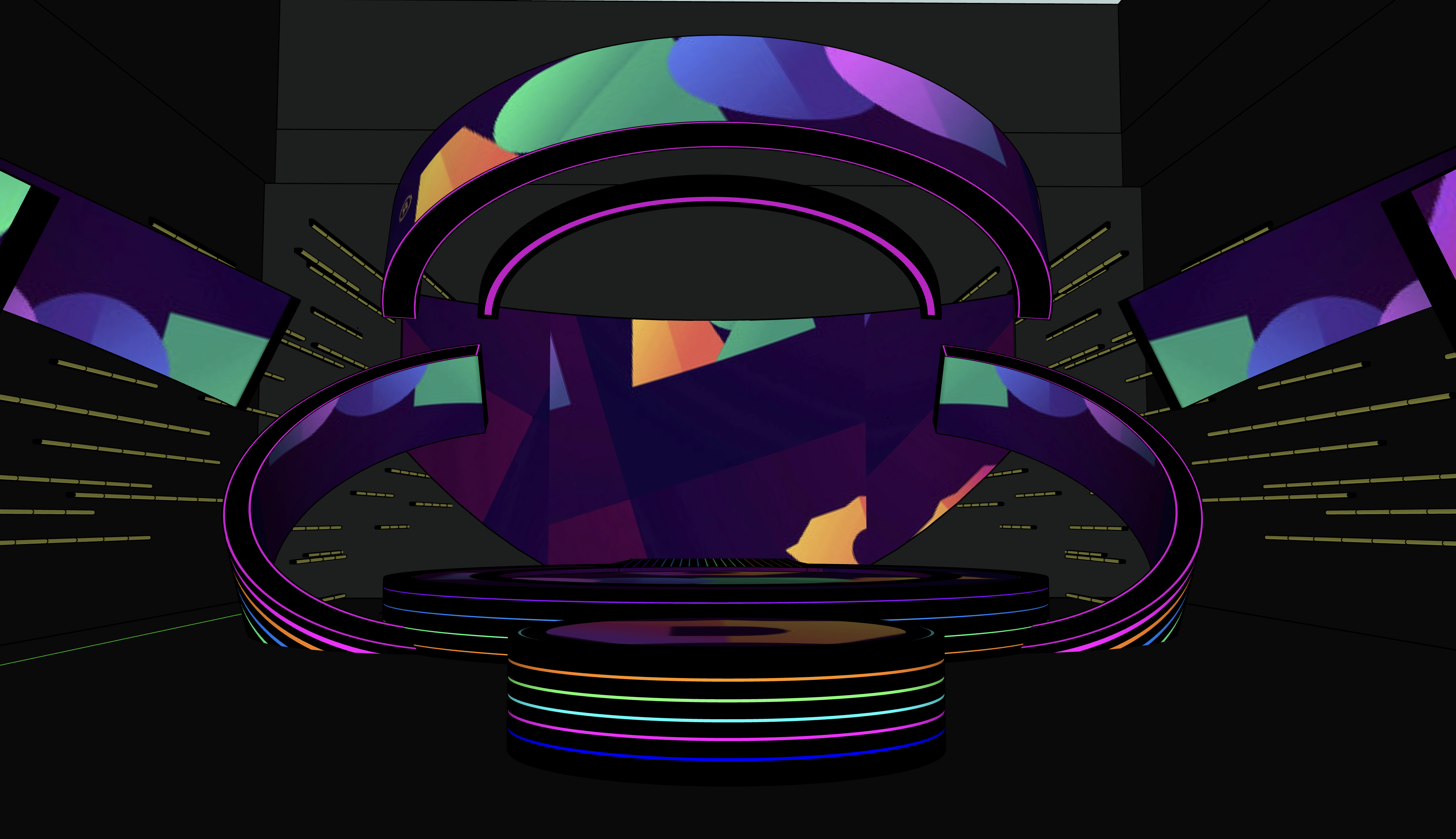 make an eurovision style stage render people on the stage haze and light beams vibrant colors low camera shot remove audience architecture