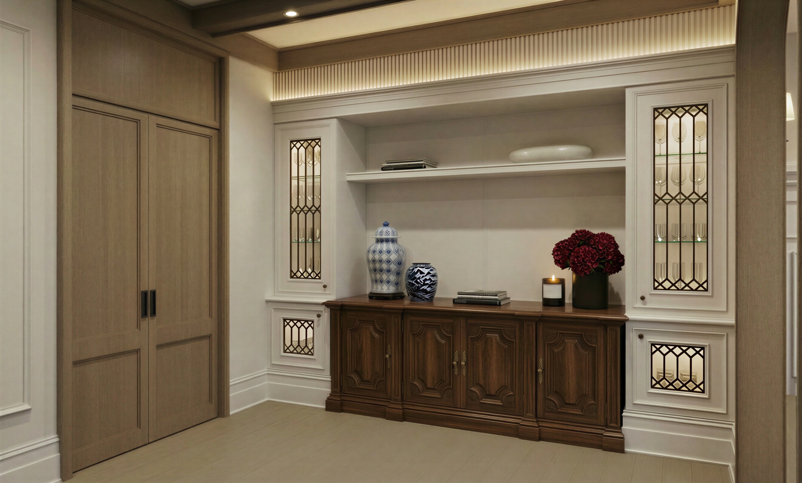 keep everything the same but leave more space on each side of the brown credenza between the two white cabinets