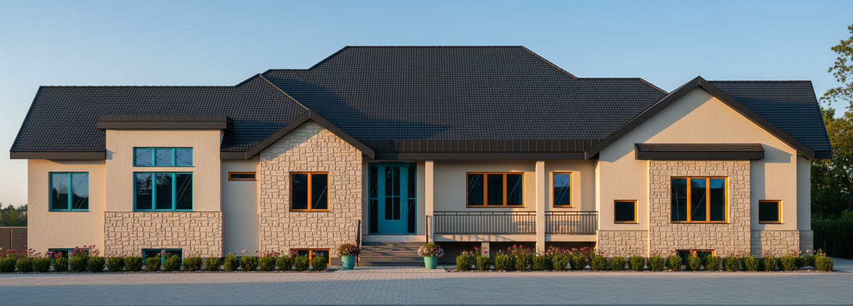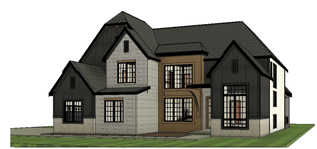 render a photorealistic 3d perspective of this house in a neighborhood lot in northern indiana reference the current material style just enhance them black standing seam metal roof with l p smartside board and batten siding wood looking vesta siding stone veneer and brick veneer to match colors keep model geometry the same windows doors roof walls concrete driveway make light vegetation and landscaping that looks native to granger in do not change the view only enhance the current materials and add minimal landscape glass reflections and a vibrant clear sky with light atmospheric depth render in hyper realistic architectural visualization quality 8k