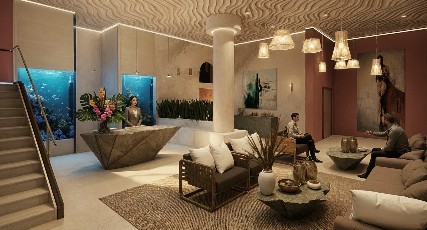 photorealistic coastal port development rendered from a sketchup massing model tropical shoreline with turquoise shallow water transitioning to deep blue sea small wooden fishing boats and dhows anchored near the beach a working port complex with a fish processing and cold storage facility in the foreground warm toned roofs and light industrial materials long concrete piers and ramps extending into the water people walking along the shore and piers at human scale large warehouse structures set back inland surrounded by palm trees green landscape buffers and sandy beach bright midday sunlight clear sky with soft clouds realistic shadows natural colors calm atmosphere aerial oblique view architectural visualization style realistic materials believable proportions no exaggerated forms