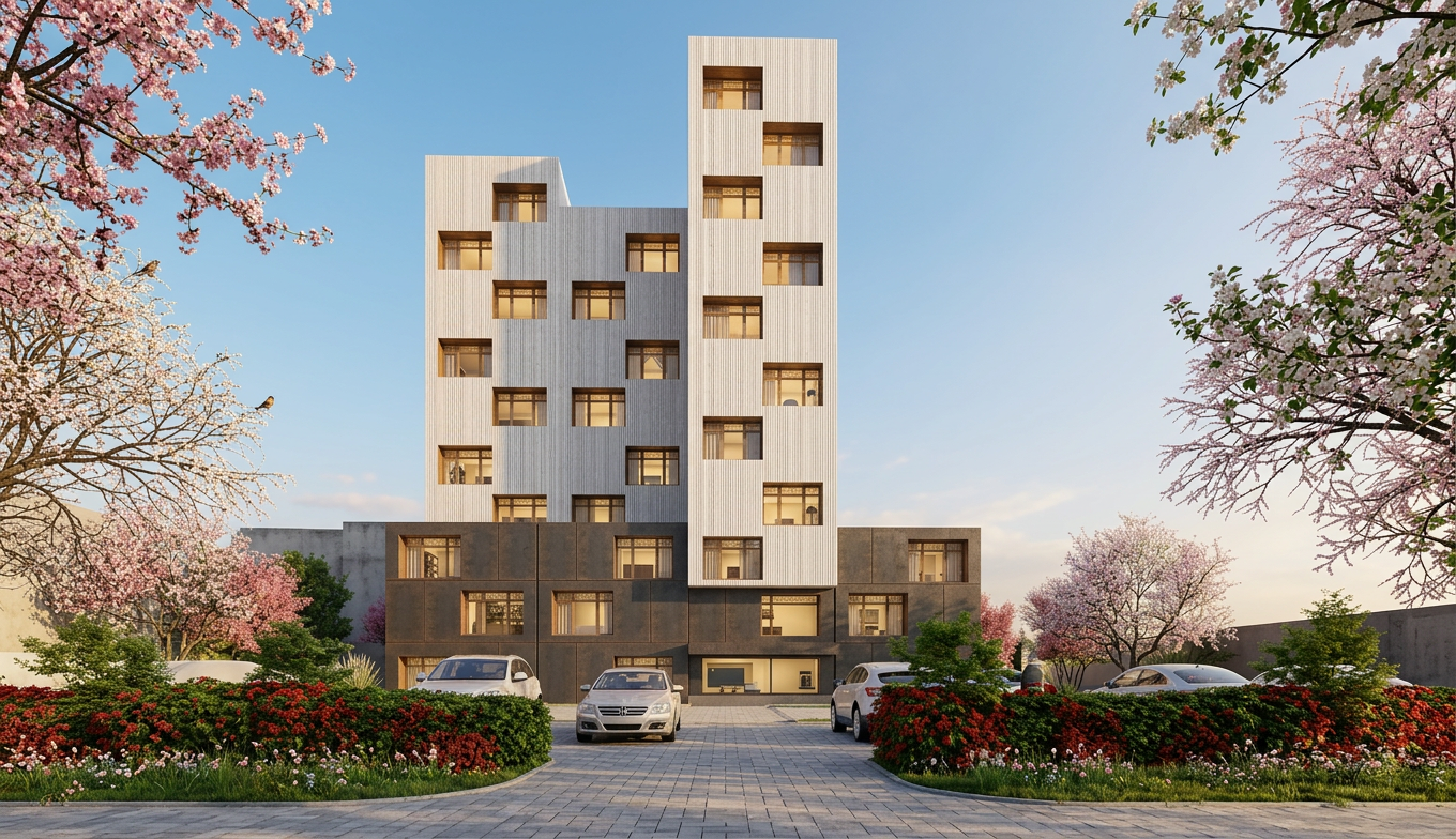a highly photorealistic high resolution 3d render perfectly replicating the perspective composition light and all elements of the interior salon scene including the light grey wood flooring ceiling track lighting potted plant both teal textured salon chairs the central door and the shelving unit with its specific products and wooden drawers the mirrors in the scene must reflect the newly modified back area with total accuracy the entire wall surface visible through the reflections of both the left and right oval mirrors is completely covered in vescom s palena 1070 17 wallpaper displaying its specific woven textured pattern within the reflection of the right mirror only the entire counter top front and sides visible in the reflection is now clad in small matte the same color all other elements of the counter and the wider reflected space remain the ou ty salon text and associated lines on the right mirror s surface are perfectly preserved the wall mounted lamps and outlets are in place the overall lighting remains directional but now interacts realistically with the new wall texture and tile surfaces in the reflection