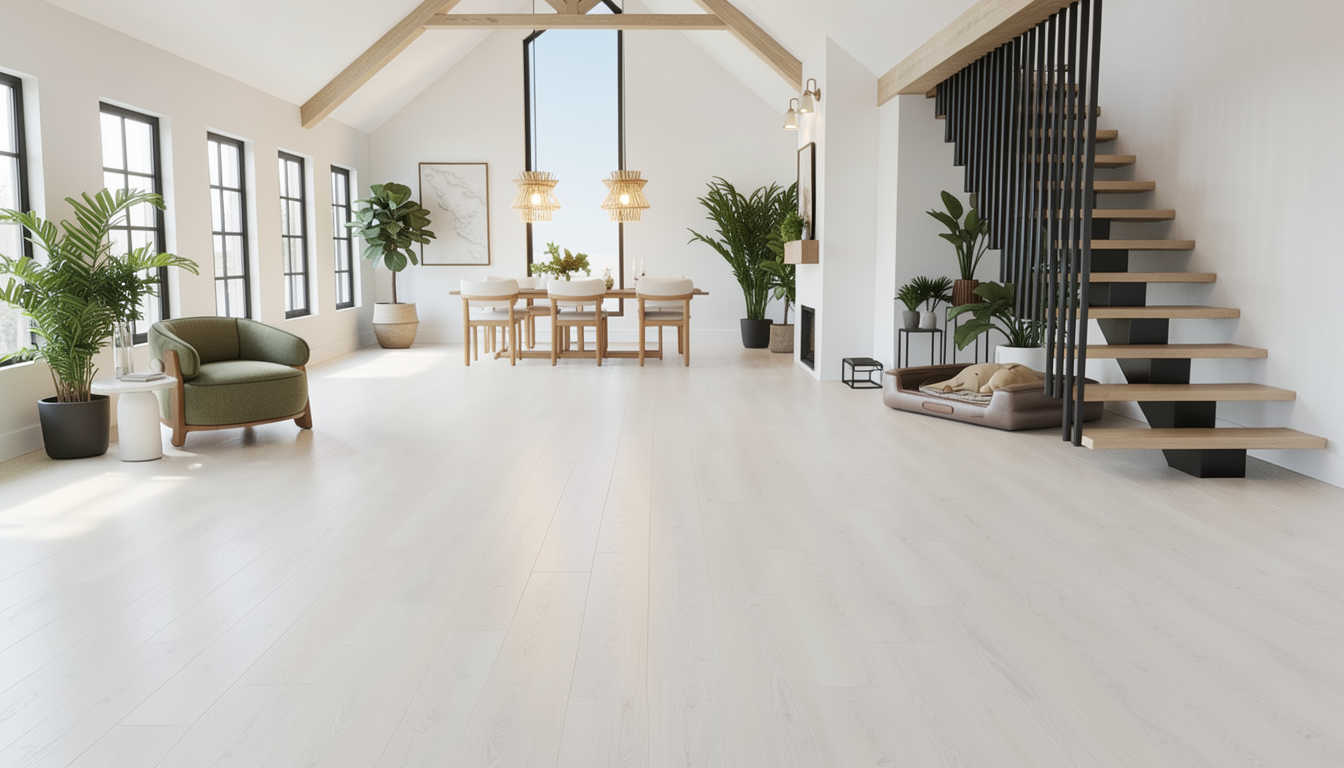 create a high res real photo with spring setting green grass full colorful bushes and plants with blue sky make look new board batten siding alabaster country white color siding and porch details new charcoal architectural roofing 16 9 ratio show 8x8 boxed columns on front porch show front door with 2 side lights remove bay window on right side replaced with a double window