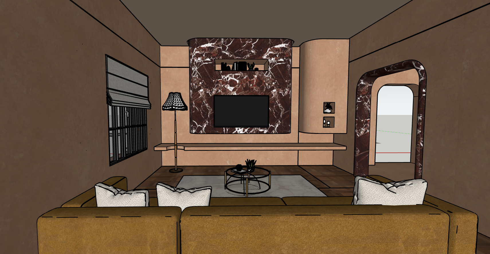 render this scene for me add magnetic track lighting and cove lighting on the edges of the ceiling the walls are lime wash the yellow fabric is suede the red marble to be made with a medium gloss finish bring this together