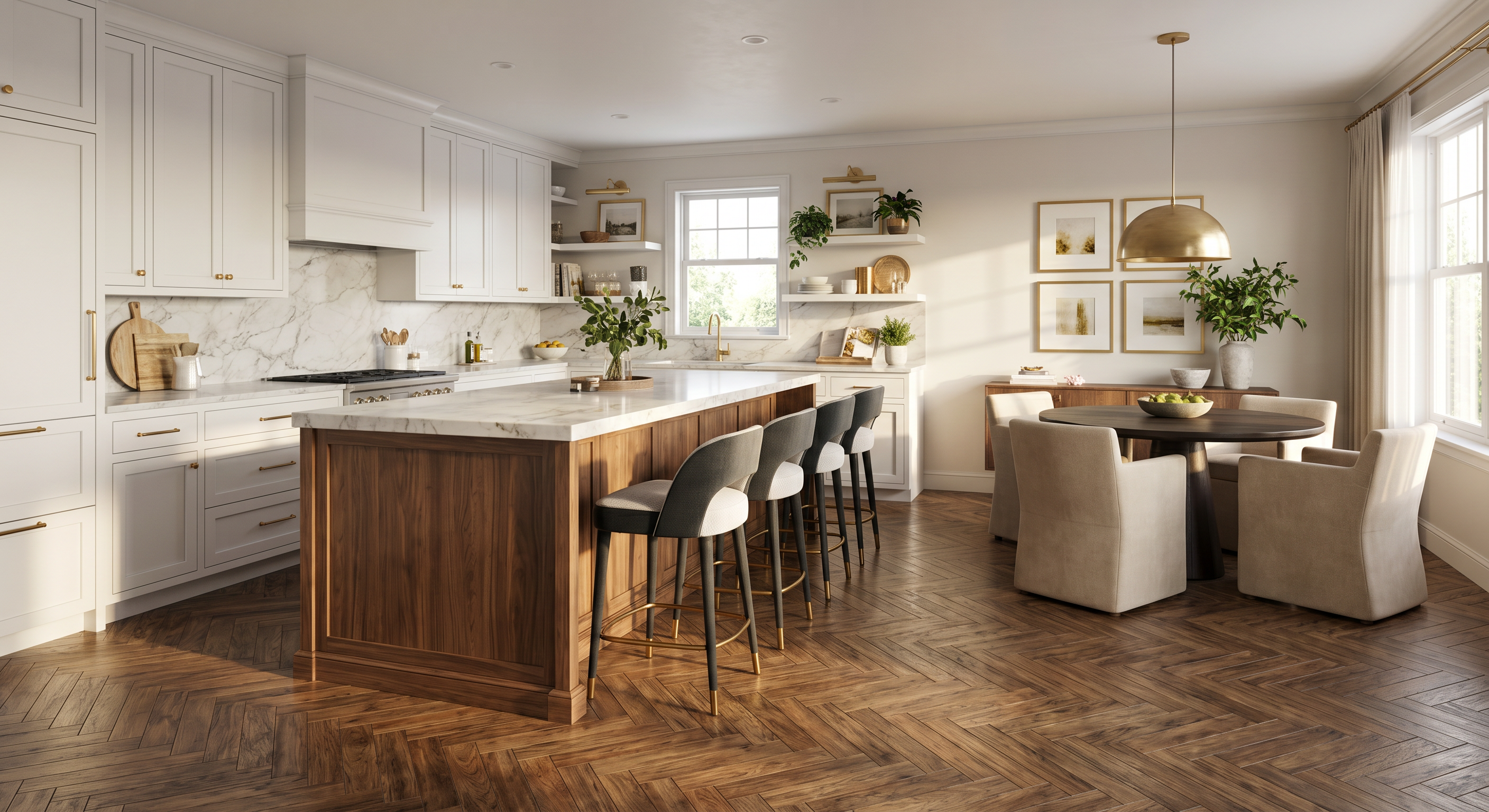 create a realistic interior architectural rendering do not change any materials or colors ceiling lights are the only source of light no lights under the upper cabinets good warm lighting