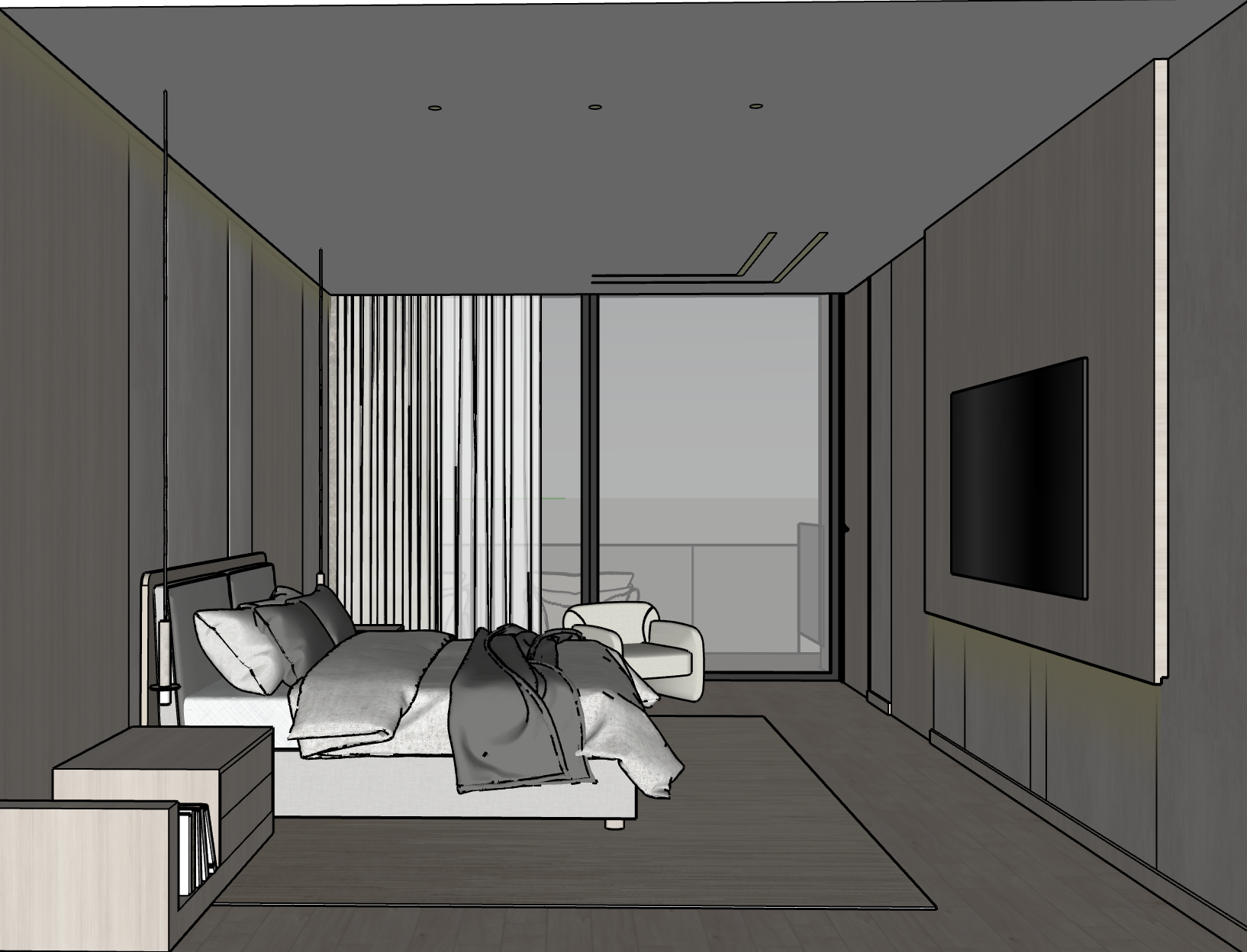 render a modern minimalistic bedroom interior with a low upholstered bed on the left side layered bedding in soft neutral fabrics and a light greige nightstand with matte finish a white lounge chair sits by the floor to ceiling glass doors covered with sheer curtains opening to a balcony the right wall features dark gray wood paneling with a recessed flat tv and subtle indirect lighting below floors are dark natural wood with a simple rug beneath the bed use a neutral cool daylight ambiance with balanced shadows and soft reflections creating a serene and sophisticated atmosphere