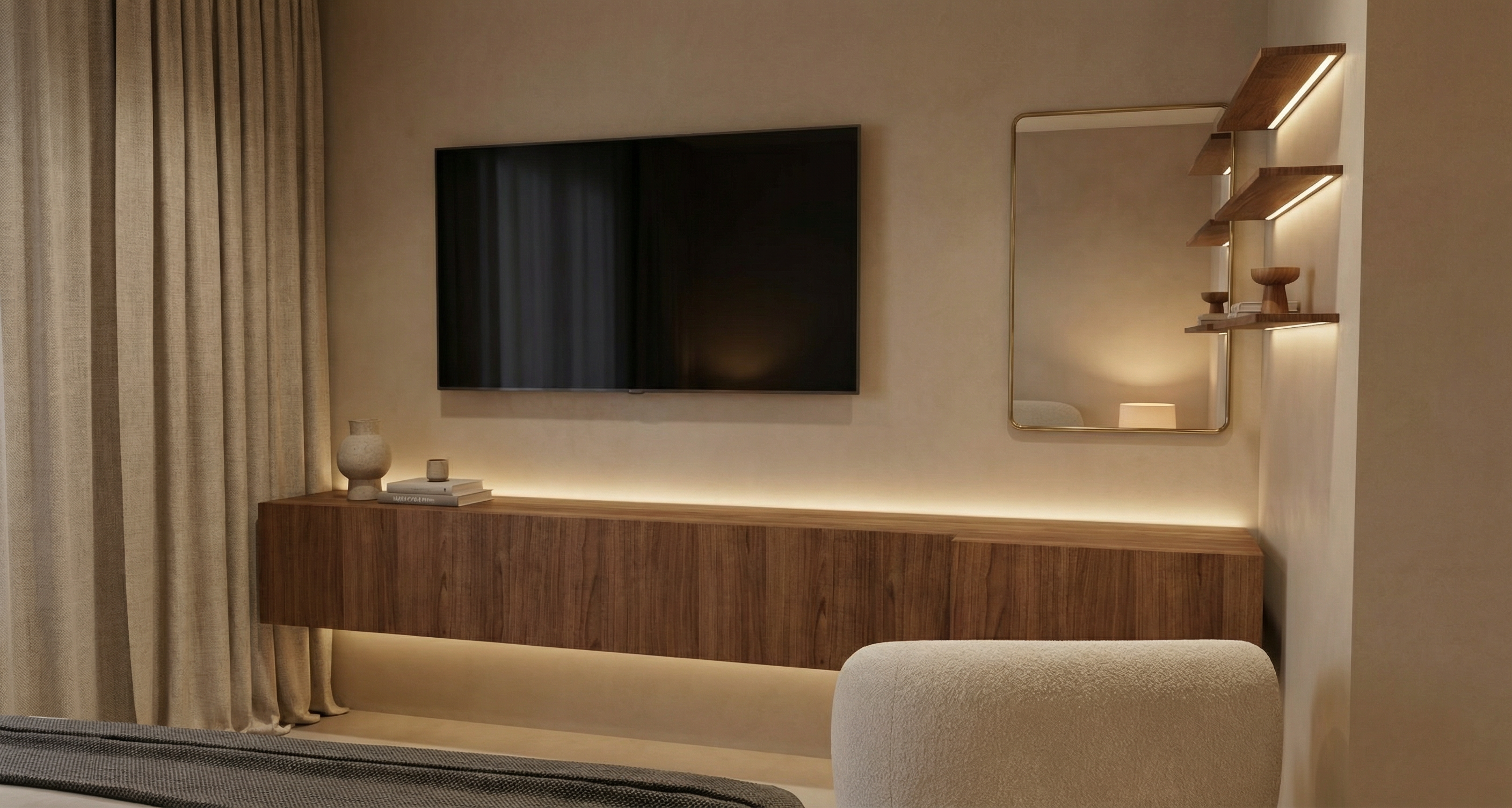 additional light cove and spot down light on ceiling enhance the brightness of the space day sun light from outside top bottom island cabinet with led strip display cabinet with some wine liquors on right of the display is white bedroom door