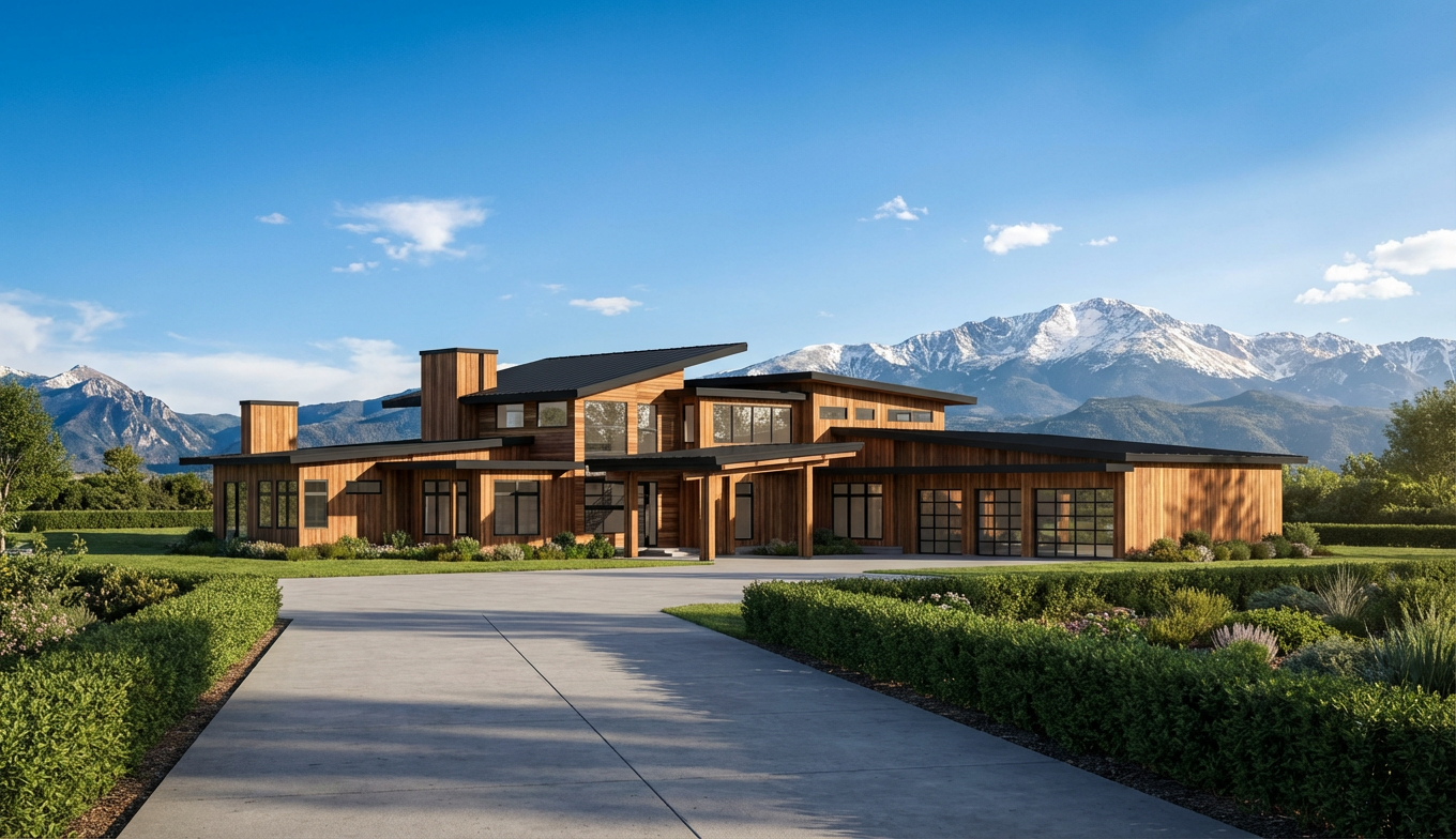 do not change the structure layout or window placement of this kitchen remove all upper cabinets keep floating shelves replace view outside through windows with a scene of blue sky and just trees everything else as shown