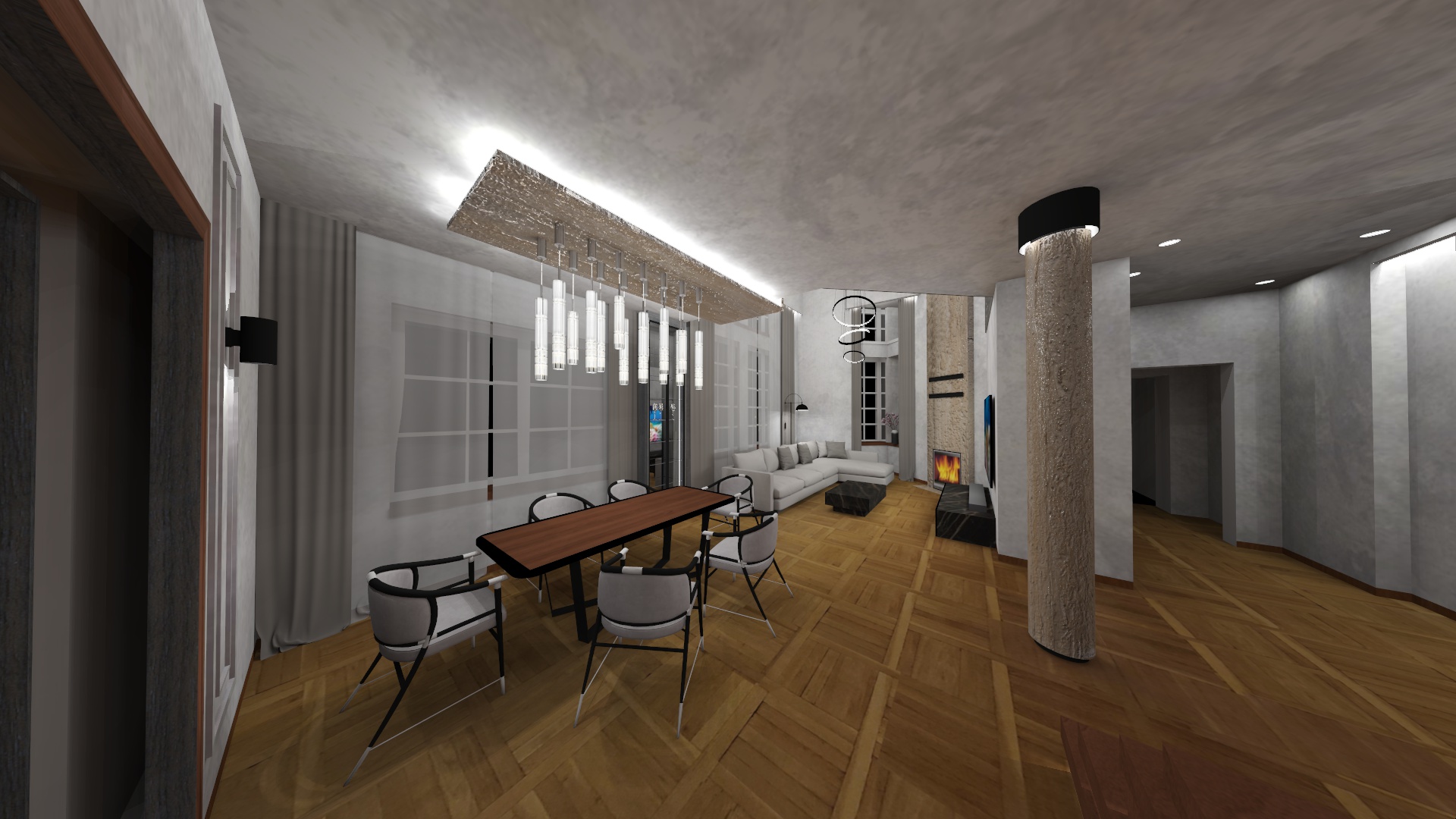 create a modern light filled living room with light colored walls and decorative polished travertine plaster accents keep the parquet flooring as is