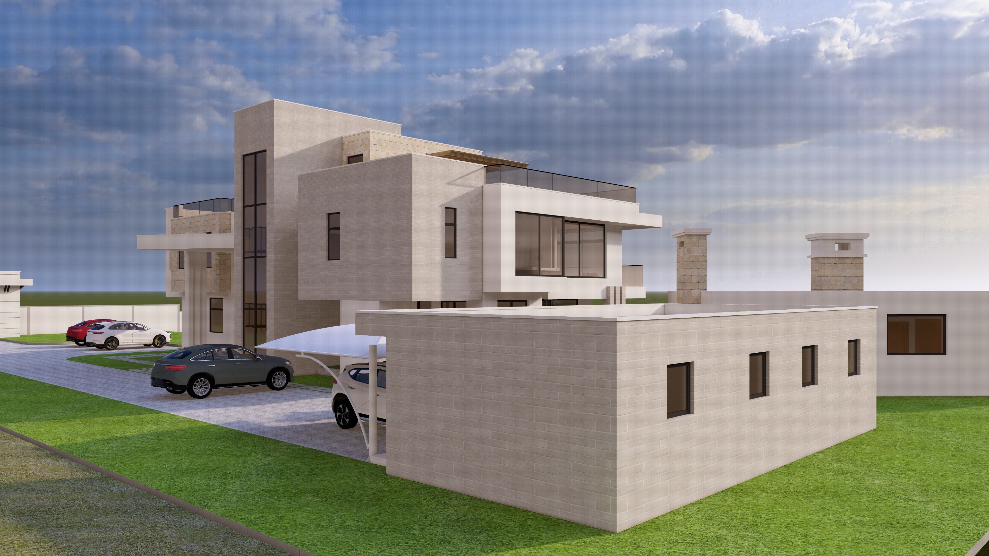 model of a villa add few trees and vegetation in background and far background to give it context