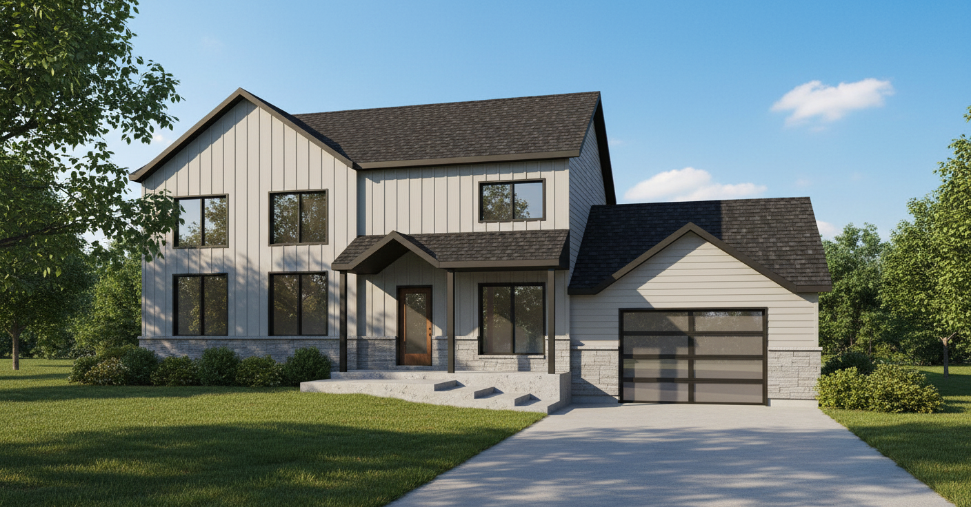 modern style house with dark roof dark cedar post red and black mix brick metal awnings dark black door and windows