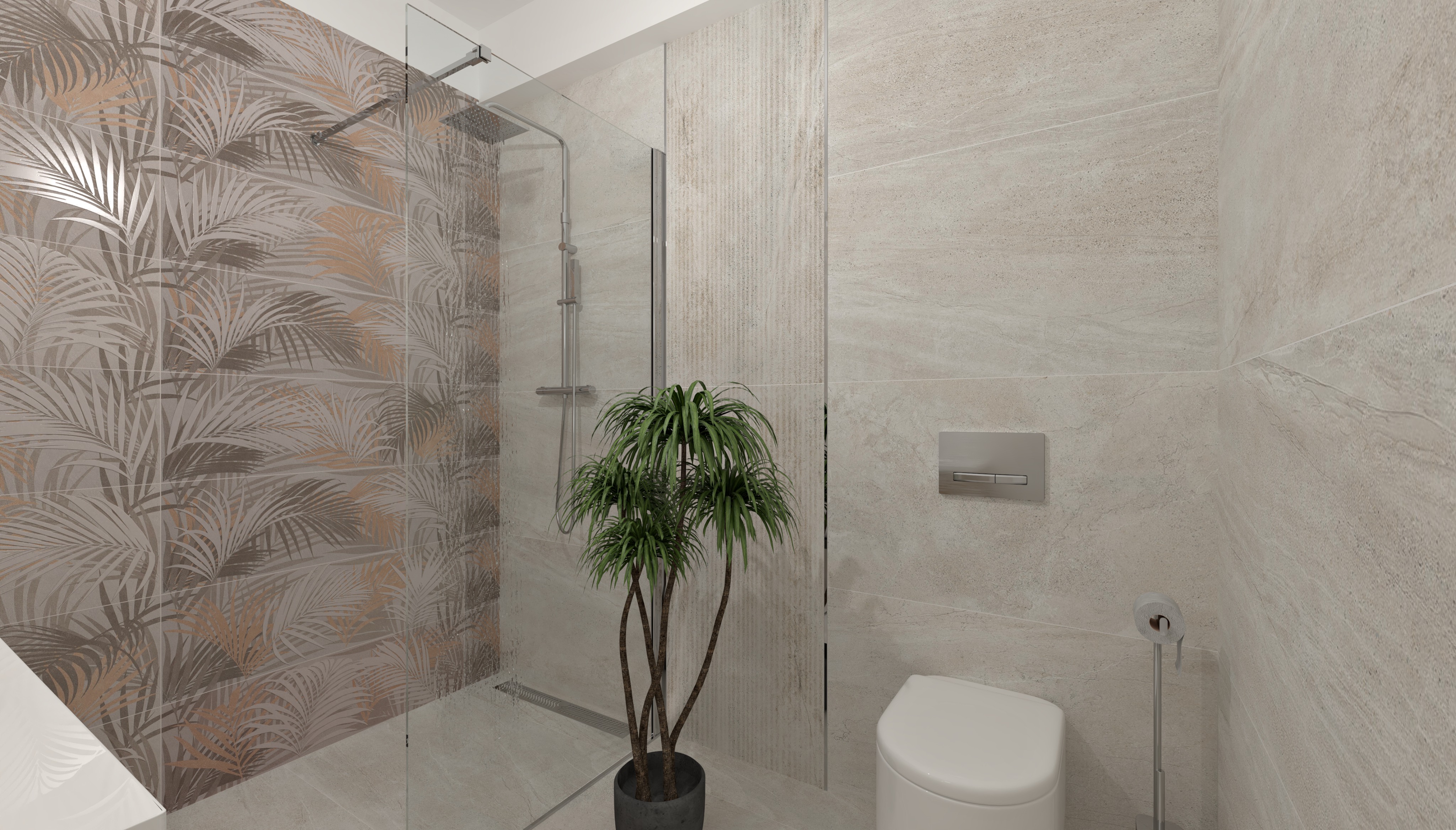 one spot light in the shower and one spot light on the toilet but not too intense neutral light just a little white