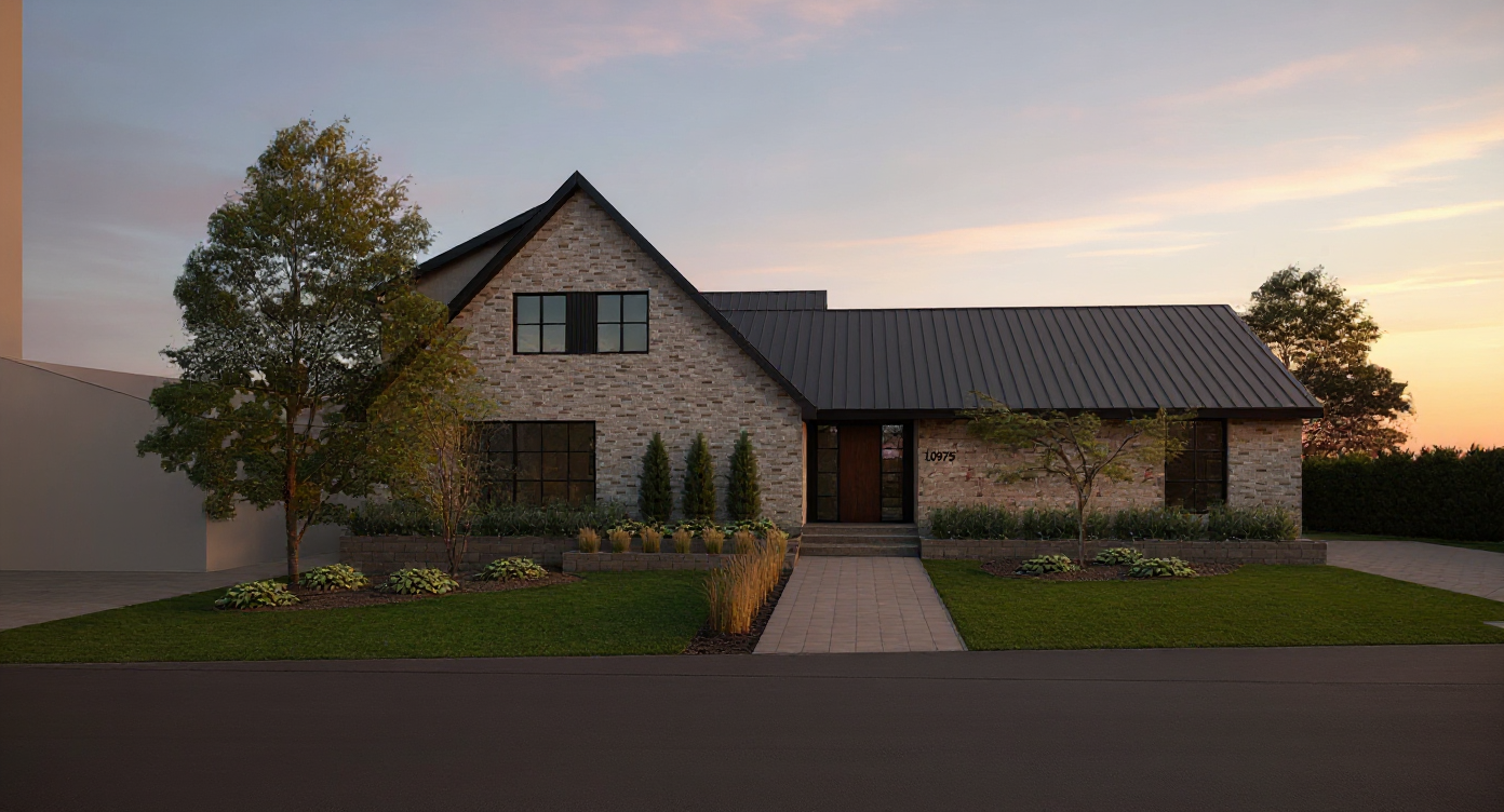 add night sky add colored christmas lights along the roofline black asphalt wet parking lot no windows behind shutters