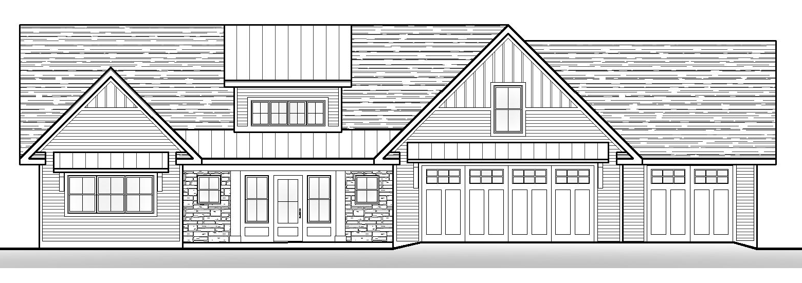 render a beautiful modern farmhouse with a cozy atmosphere the main exterior features a combination of white and light gray siding complemented by rustic stone accents in natural earth tones the roof is a warm charcoal gray with subtle texture the doors and window frames are dark walnut brown wood for a rich contrast add soft ambient sunset lighting to enhance the warm inviting feel surround the house with green lush landscaping and a clear blue sky with hints of orange and pink from the setting sun