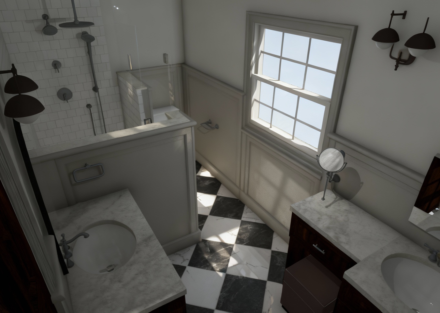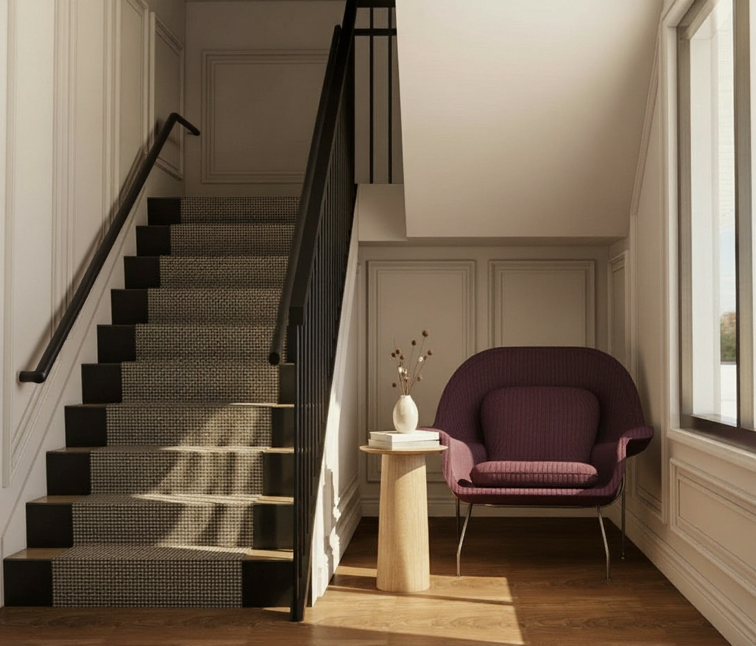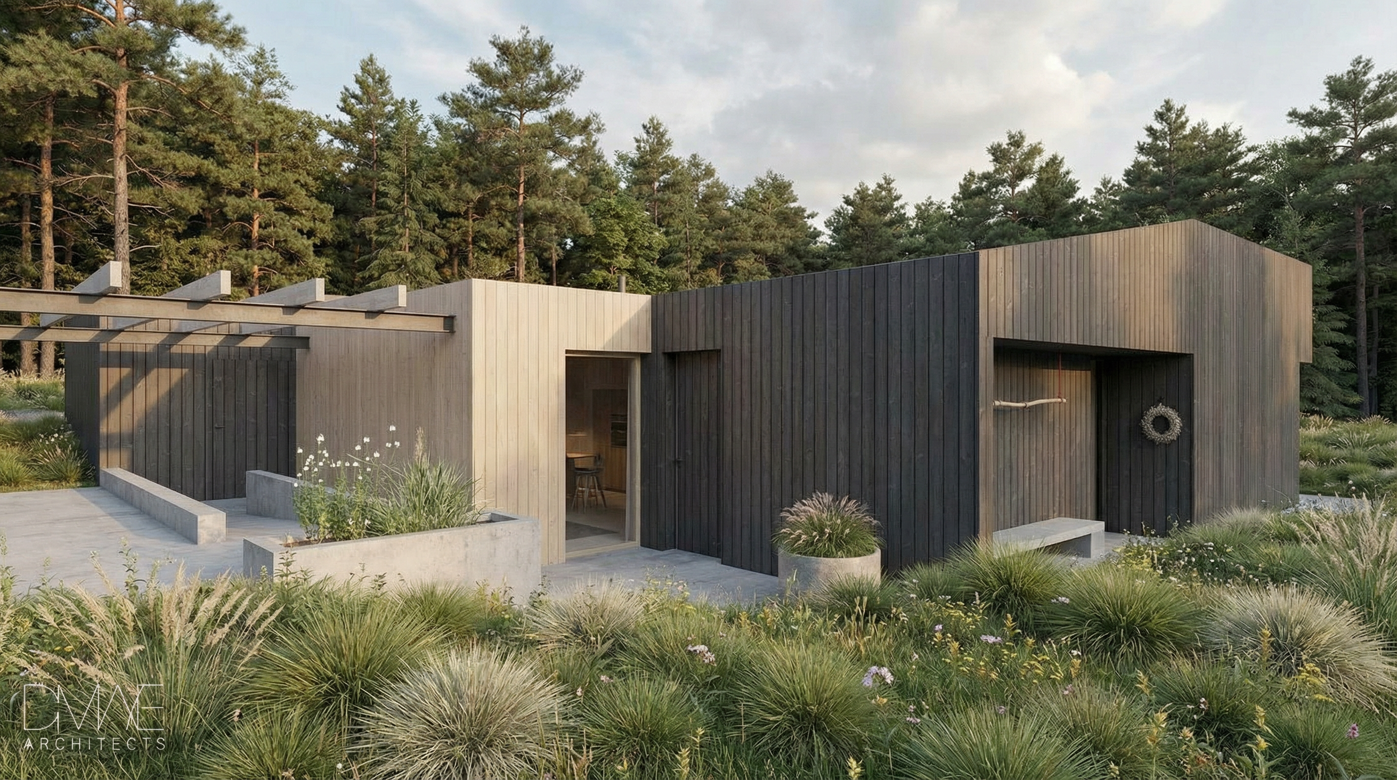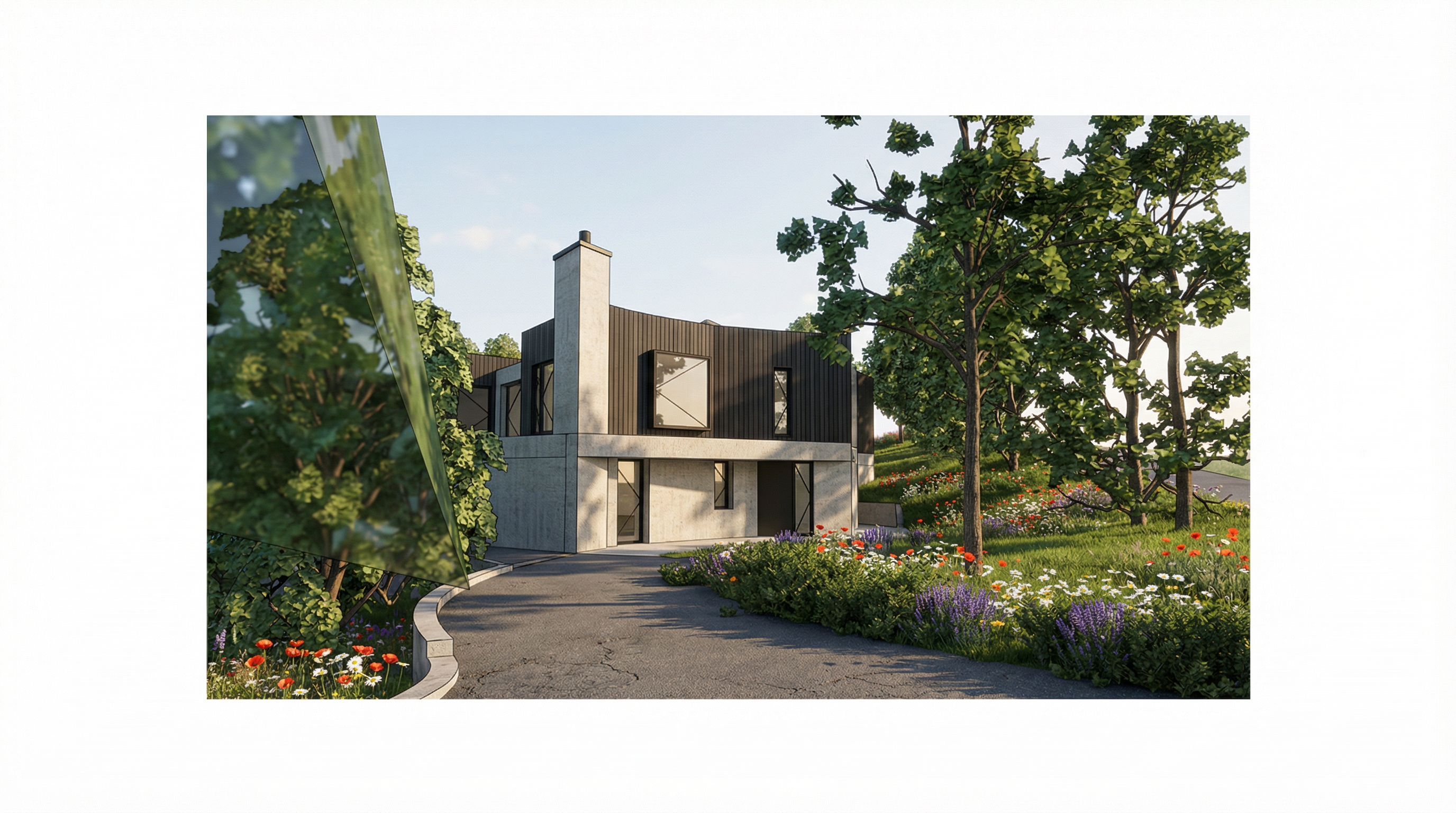 do not change perspective and proportions of image add some wild flowers to some of the grass areas add vertical black modern cladding to the upper level dark walls