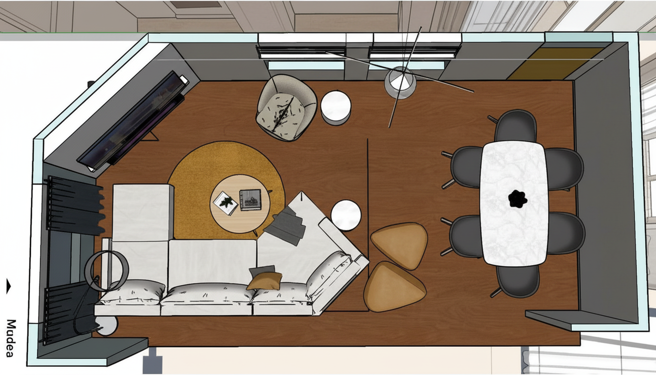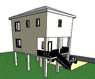 the roof is light color metal the walls are a very pale yellow the window trim is white the home is in a tropical setting with coconut palms nearby