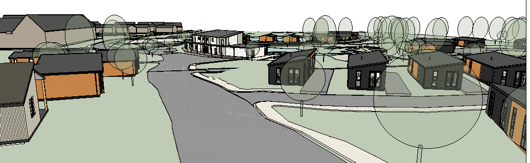 render a holiday park with black and timber clad lodges should be set in spring in the british countryside with native planting and light foliage there should be a red brick housing estate in the background and a red brick care home