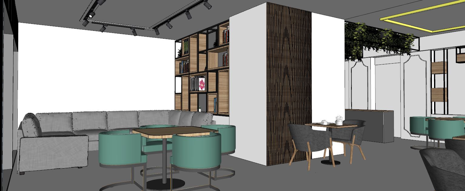 keep materials in the picture same floor tile white plain chairs mint green fabric the left on wall is fluted wood keep photo real