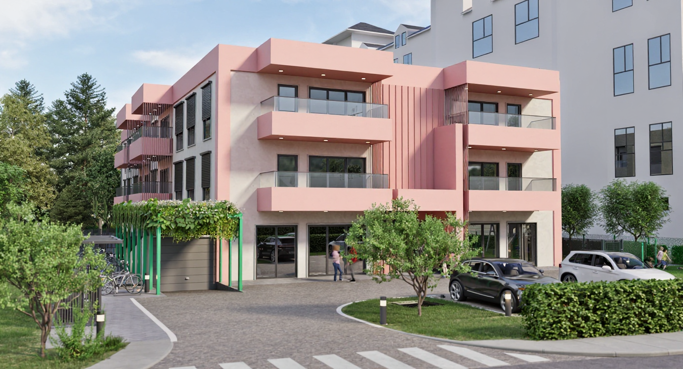 the color of the main facade should be light braun the color of the balconies and corner accents should be light vanilla light brown the color of the red columns should change from red to black