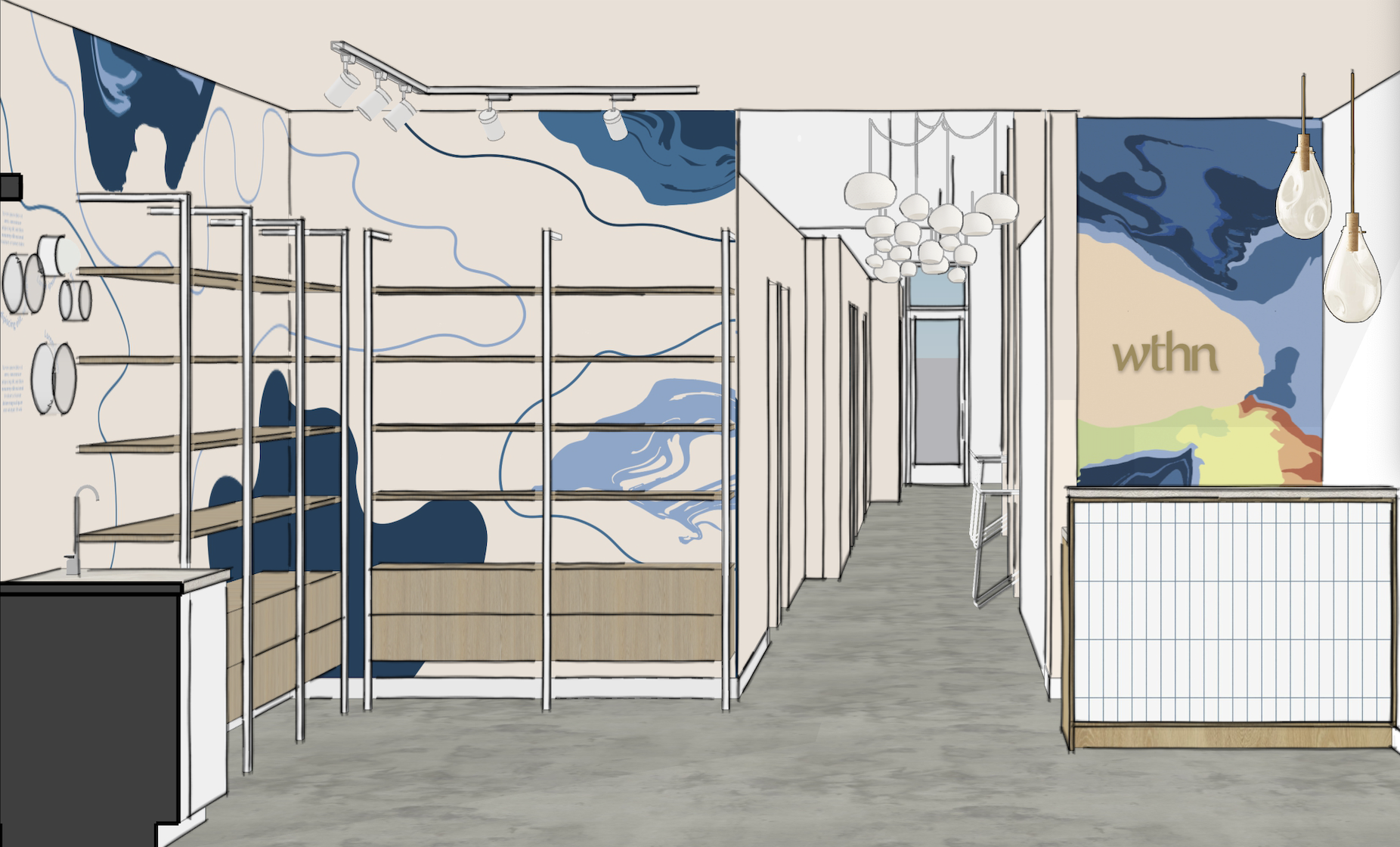 bright day time natural lighting soft shadows space is evenly lit downlights and pendant lights on 3000k lighting temperature interior photography realistic slightly reflective cement floor finish front desk matte white tile track shining 3000k light on shelves hallway pendants 3000k light illuminating floor view into yard with greenery out back glass door
