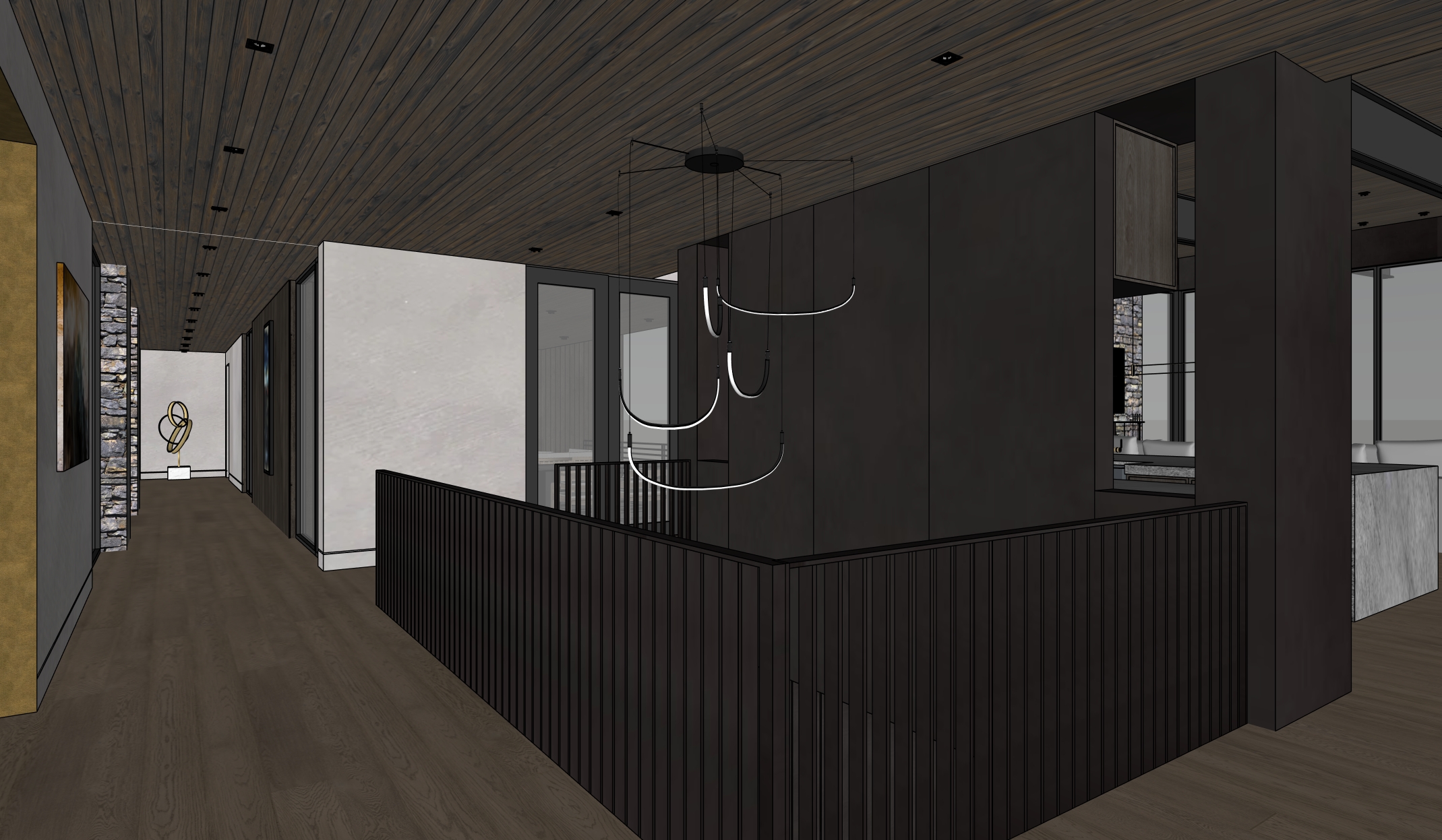 do not remove or change any geometry in image rough hewn tennessee fieldstone stained straight grain white oak tongue and groove ceiling dark metal window frames cold rolled steel panels smooth finished stucco walls home located in north carolina hardwood forest with dense trees below home soft early morning light with light fog in trees behind view of blue ridge mountains in distance room is 20 above the ground so no plants or hardscape directly outside of windows add painting to blank wall add tapestry to steel wall