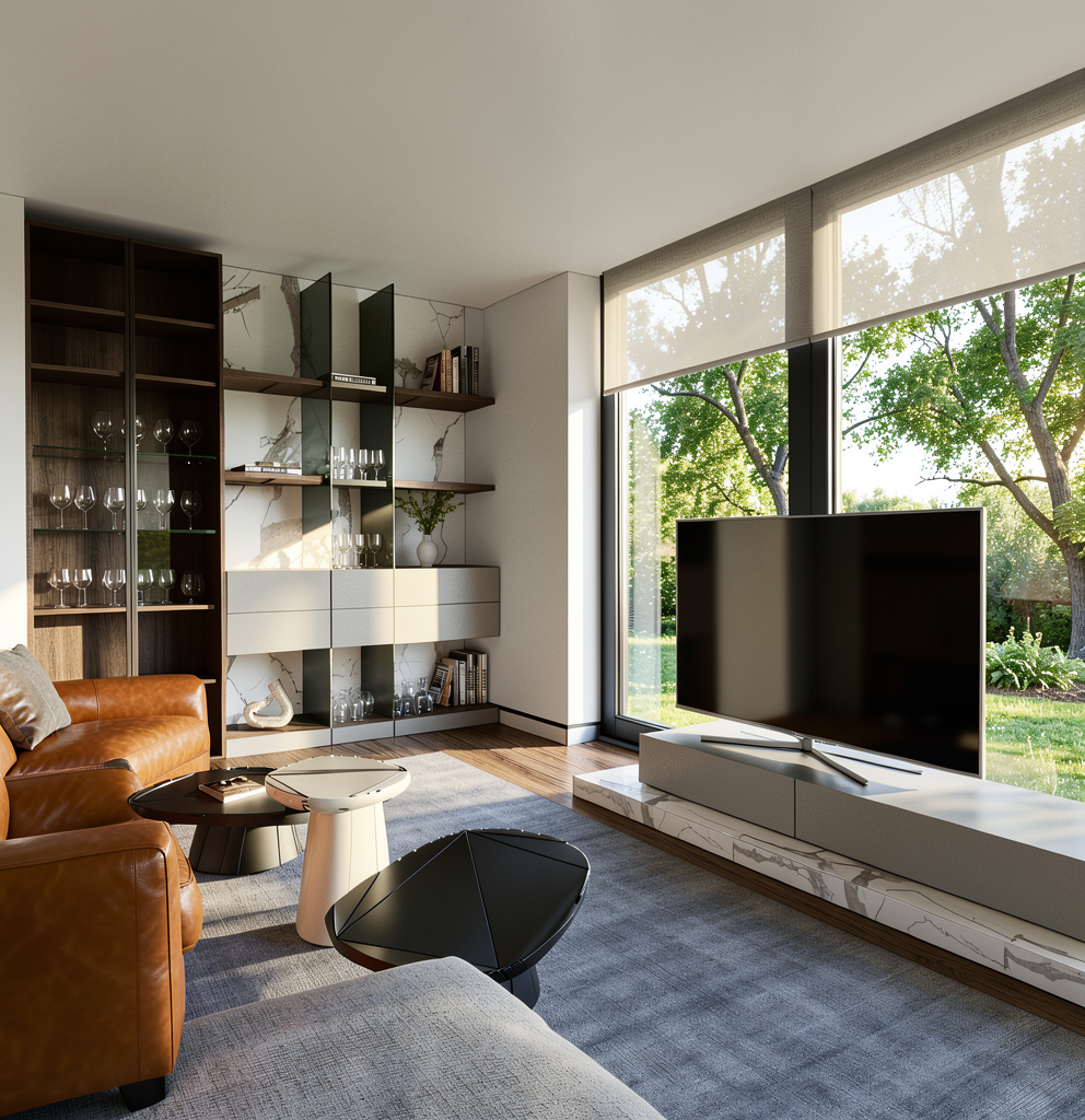convert this floor plan into a realistic isometric 3d view of a living room show the space from an elevated angle with furniture walls and details visible black piano straight timber lay floorboards natural beige rug light beige fabric sofa timber coffee table two plants in green pots timber entertainment unit use the same furniture as shows on the plan do not change the orientation of the floorplan