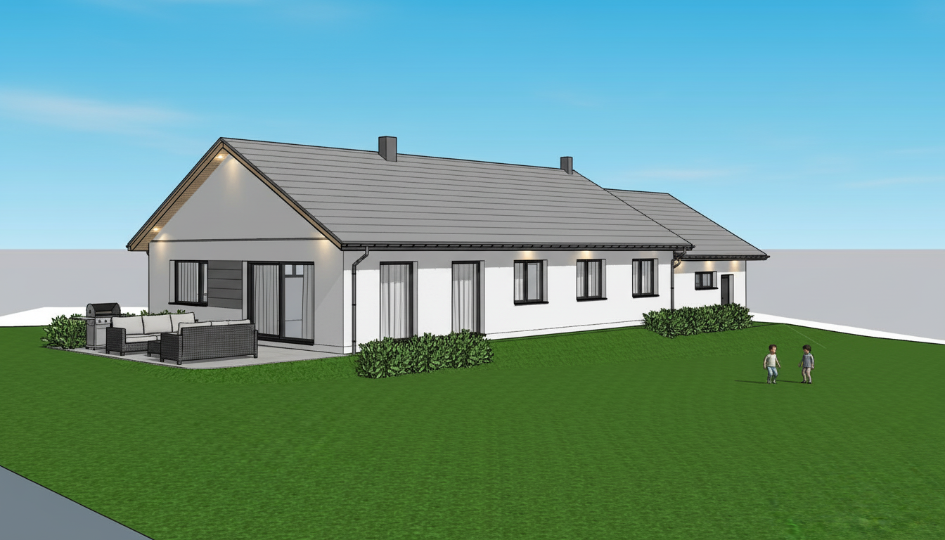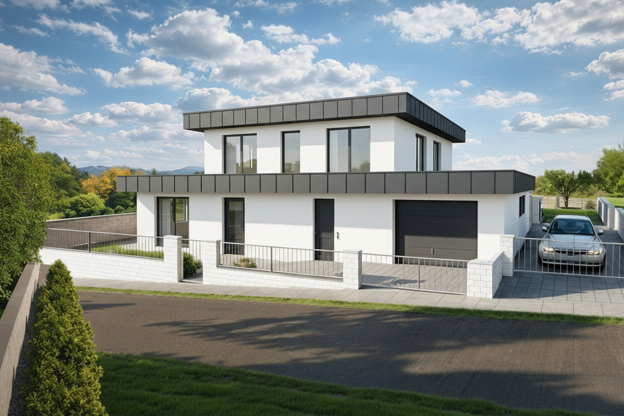 make the following material adjustments only change the fence color to anthracite matching the metal parapet roof cladding color exactly the fence should visually read as part of the same material family as the roof metal add vertical wooden facade slats between the far left glazed doors on the ground floor and the garage door on the right use natural vertical wooden lamellas as a warm accent similar in style and proportion to the original visualization previously provided do not change building shape roof design window sizes or positions camera angle or surroundings