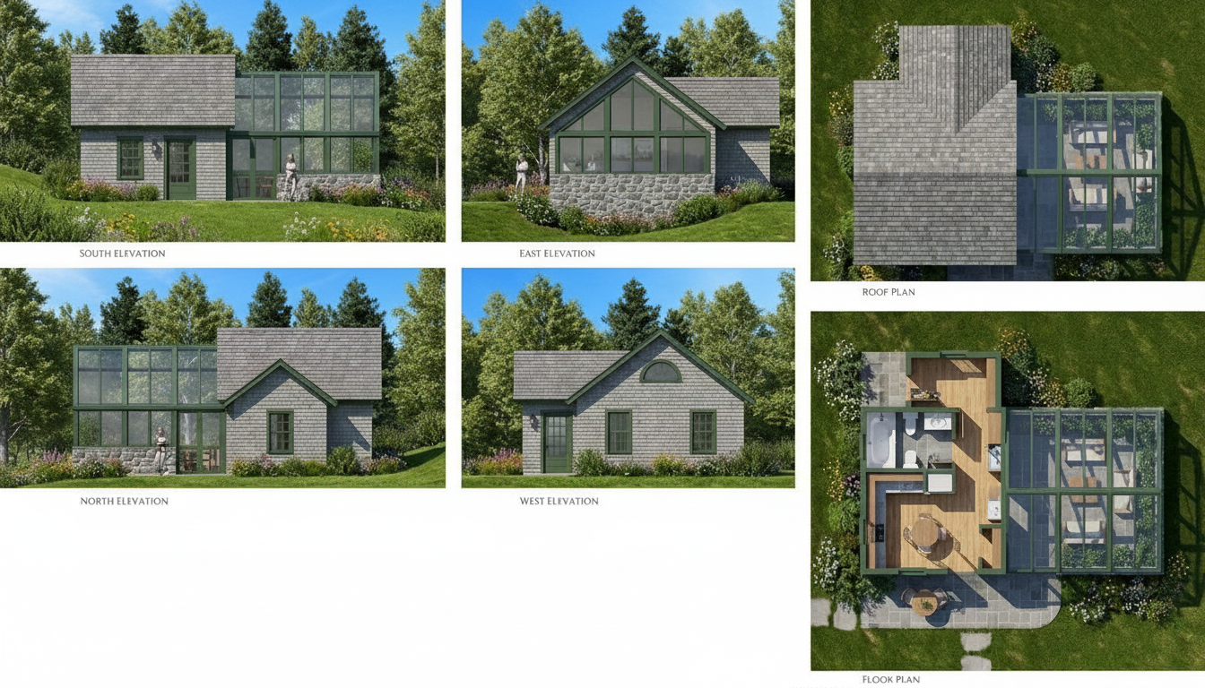 change gray stone base to a mix of gray and tan stones add plants inside greenhouse make walls in bottom floor plan dark gray