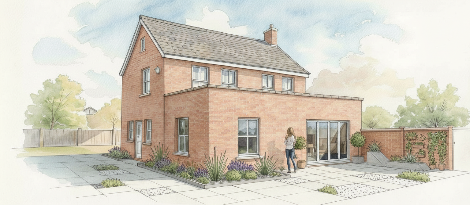 make single story extension render make water colour with sketch pen remove planters boxes near boundary