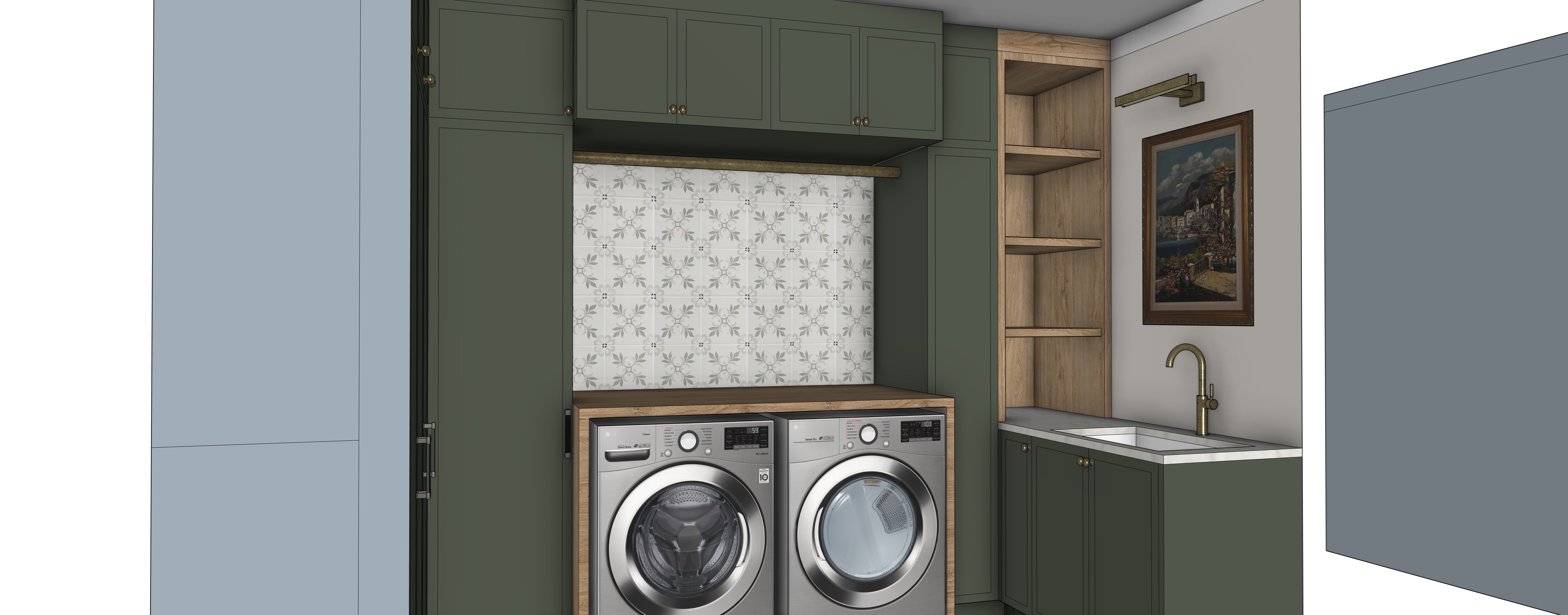 photorealistic traditional laundry room rendering prompt create a highly photorealistic interior rendering of a traditional residential laundry room using the provided reference image as a fixed architectural model the layout cabinetry proportions appliance placement shelving and camera perspective must remain exactly as shown do not redesign or reposition elements the space should feel refined warm and tailored similar to a professionally photographed custom home utility room architecture to preserve exactly side by side front load washer and dryer centered within a cabinet alcove painted cabinetry in deep muted green upper cabinets above the washer dryer wood countertop spanning above appliances decorative tile backsplash behind the appliances vertical cabinet panels framing the washer dryer adjacent sink cabinet to the right undermount sink with brass gooseneck faucet open wood shelving unit between sink and appliance wall additional tall cabinet panels surrounding the space wall mounted brass picture light above artwork framed artwork above the sink white painted wall behind the sink area maintain exact cabinet alignment spacing and appliance placement materials and realism enhance realism with physically accurate materials cabinetry painted wood in deep muted green smooth satin finish with subtle light reflection crisp panel detailing and shadow depth brass knobs with warm aged patina wood elements natural wood shelving and countertop visible grain variation slight satin sheen appliances stainless steel washer and dryer realistic reflections on metal and glass doors subtle interior drum visibility tile backsplash patterned tile with soft tonal variation light grout lines with slight irregularity matte to low sheen finish sink counter light stone or quartz countertop subtle edge profile undermount sink with clean edge detail hardware fixtures brass faucet and picture light with warm patina lighting use layered realistic architectural lighting soft ambient daylight gentle highlight on cabinetry edges subtle reflections on appliances and faucet light shadowing beneath upper cabinets and shelving lighting temperature 3500 4000k warm neutral camera settings eye level perspective 5 ft height 28 35mm architectural interior lens straight on or slightly angled view high dynamic range ultra high resolution 4k 8k styling minimal controlled add only subtle realism a folded towel or small basket on shelf minimal accessories avoid clutter rendering style professional architectural interior photography clean natural balanced lighting realistic materials and shadows the result should look like a luxury custom home laundry room photograph not a stylized cgi render geometry guardrail critical treat the reference image as a fixed 3d model do not change cabinet layout do not move washer dryer do not alter shelving placement do not add or remove cabinetry maintain exact proportions and camera angle enhance materials lighting and realism only preserve all cabinetry and appliance geometry exactly do not reinterpret built ins do not add remove or modify cabinetry