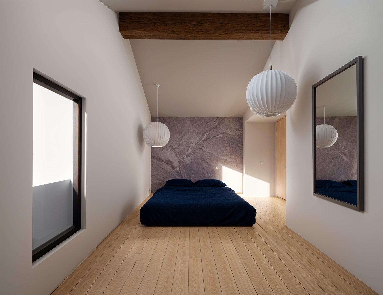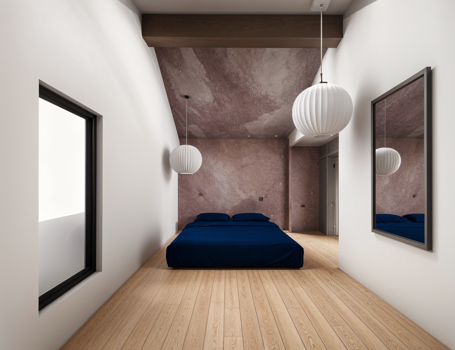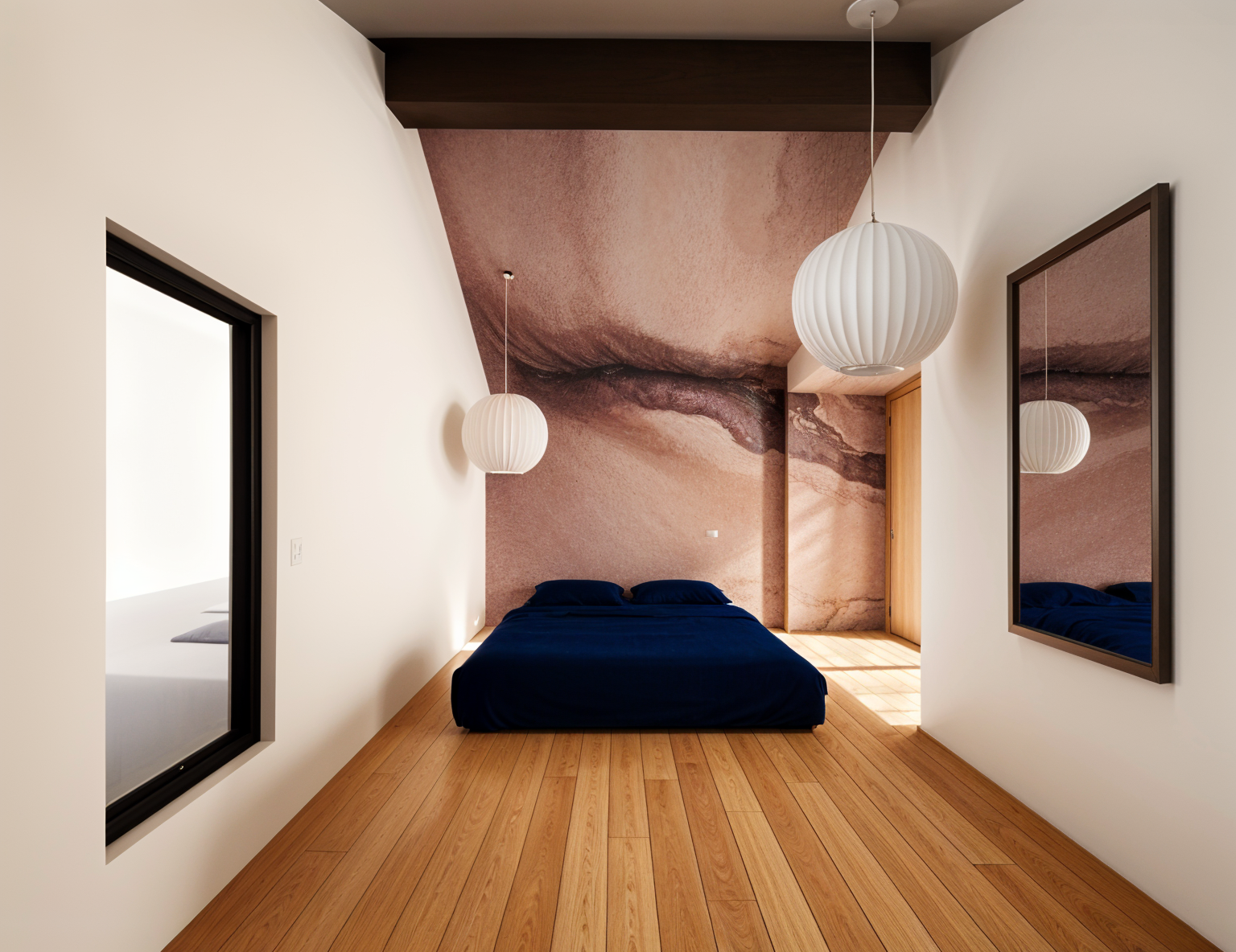 baltic birch floors abstract wall paper left wall tones are variations of mauve or desert rose have reflections in mirror grey rectangle on wall room in back has concrete floors iluminate room from pendant evening warm light