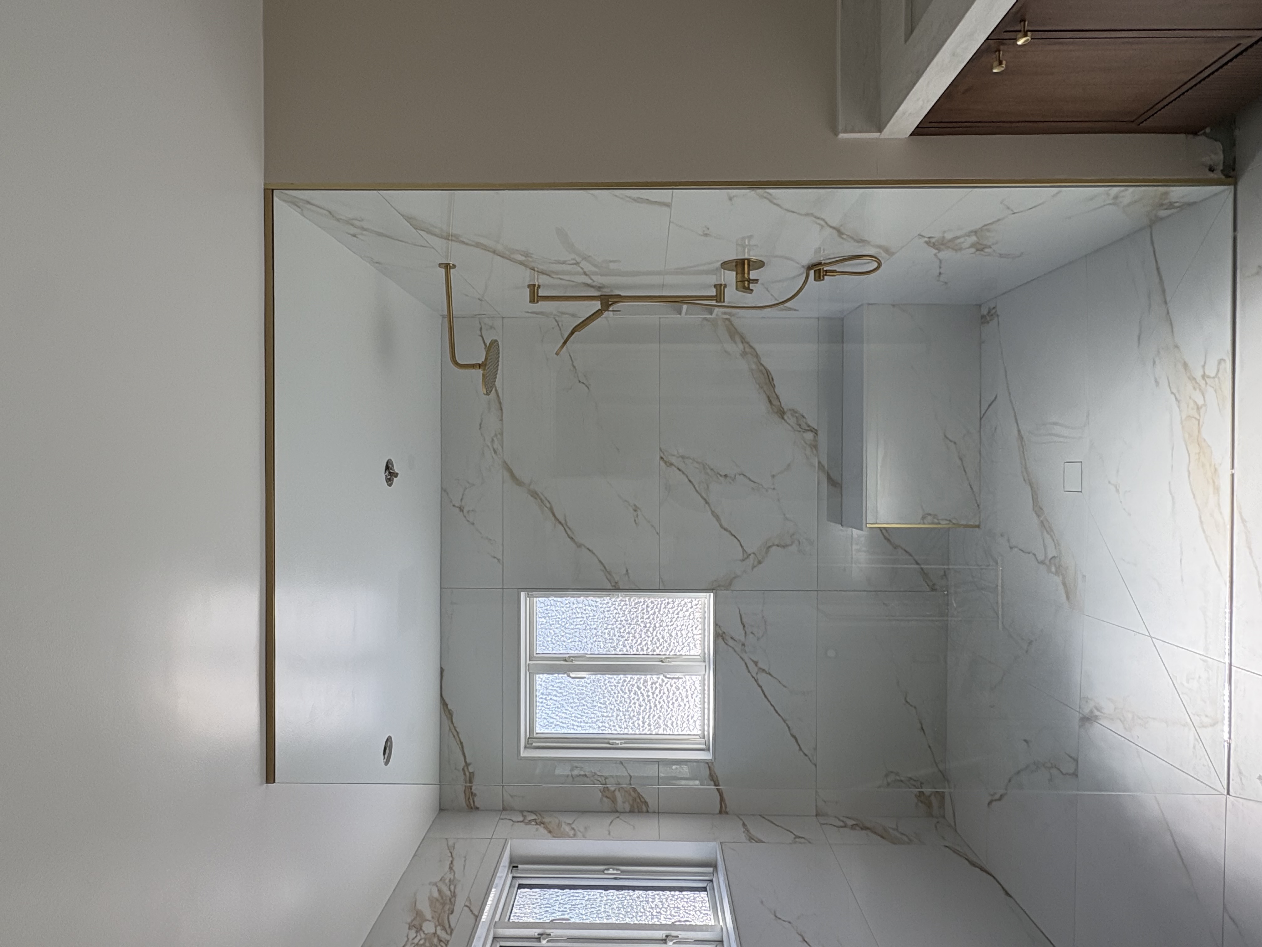 please help me showcase more effective shower heads for this design the current trim feels a little too small for re size of the shower i feel it needs to make a statement